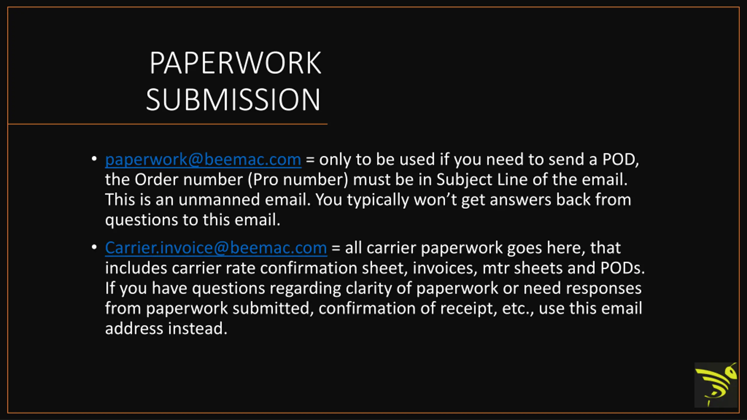 PAPERWORK SUBMISSION paperwork@beemac.com = only to be used if you need to send a POD, the Order number (Pro number) must be in Subject Line of the email. This is an unmanned email. You typically won t get answers back from questions to this email. Carrier.invoice@beemac.com = all carrier paperwork goes here, that includes carrier rate confirmation sheet, invoices, mtr sheets and PODs. If you have questions regarding clarity of paperwork or need responses from paperwork submitted, confirmation of receipt, etc., use this email address instead.