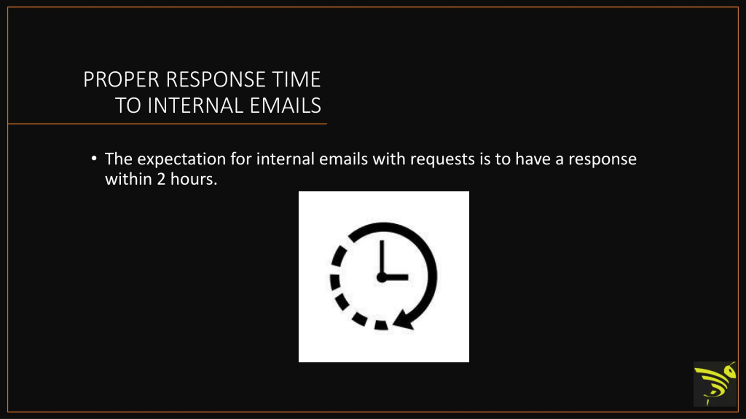 PROPER RESPONSE TIME TO INTERNAL EMAILS The expectation for internal emails with requests is to have a response within 2 hours.