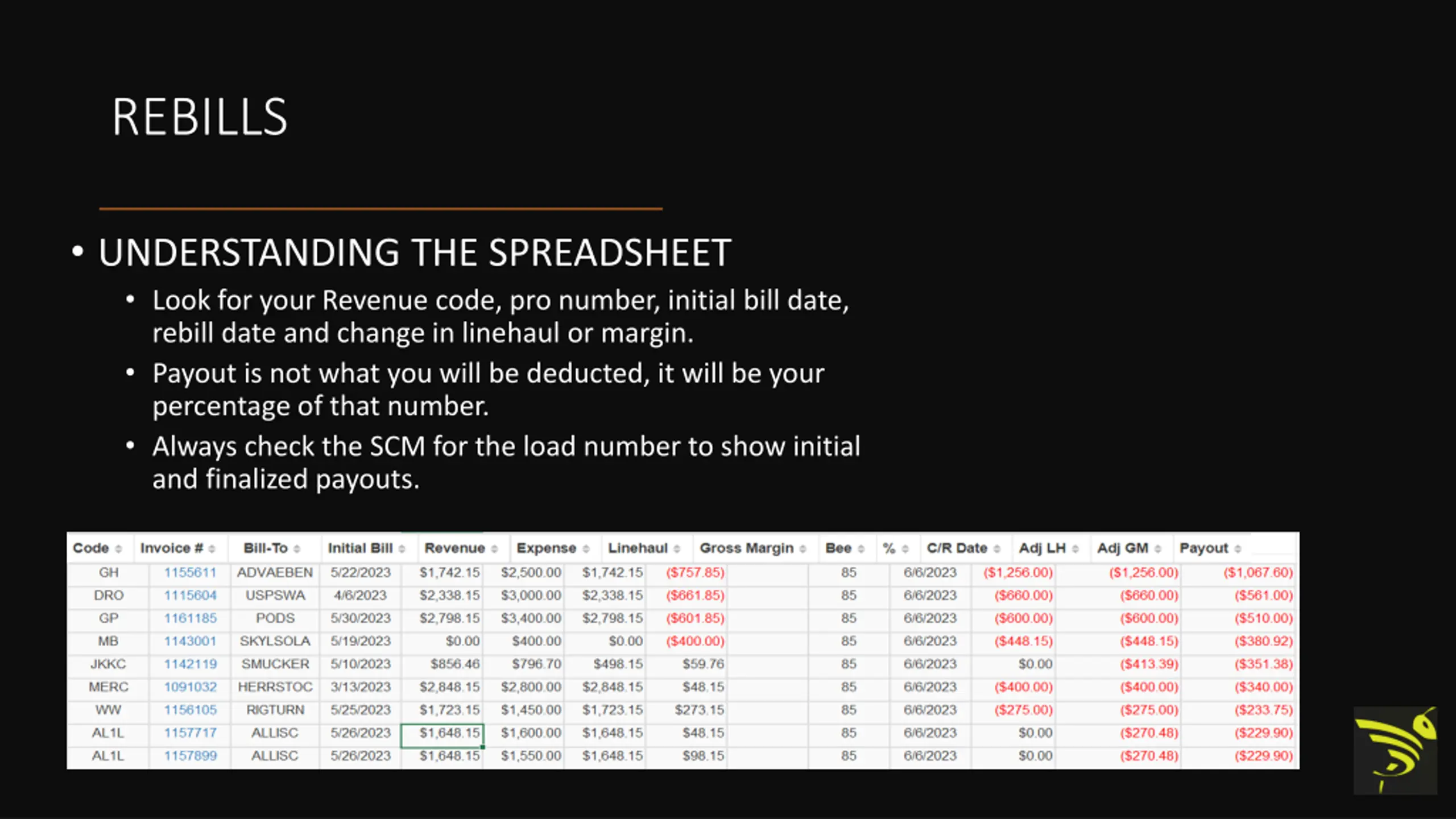 REBILLS UNDERSTANDING THE SPREADSHEET Look for your Revenue code, pro number, initial bill date, rebill date and change in linehaul or margin. Payout is not what you will be deducted, it will be your percentage of that number. Always check the SCM for the load number to show initial and finalized payouts.