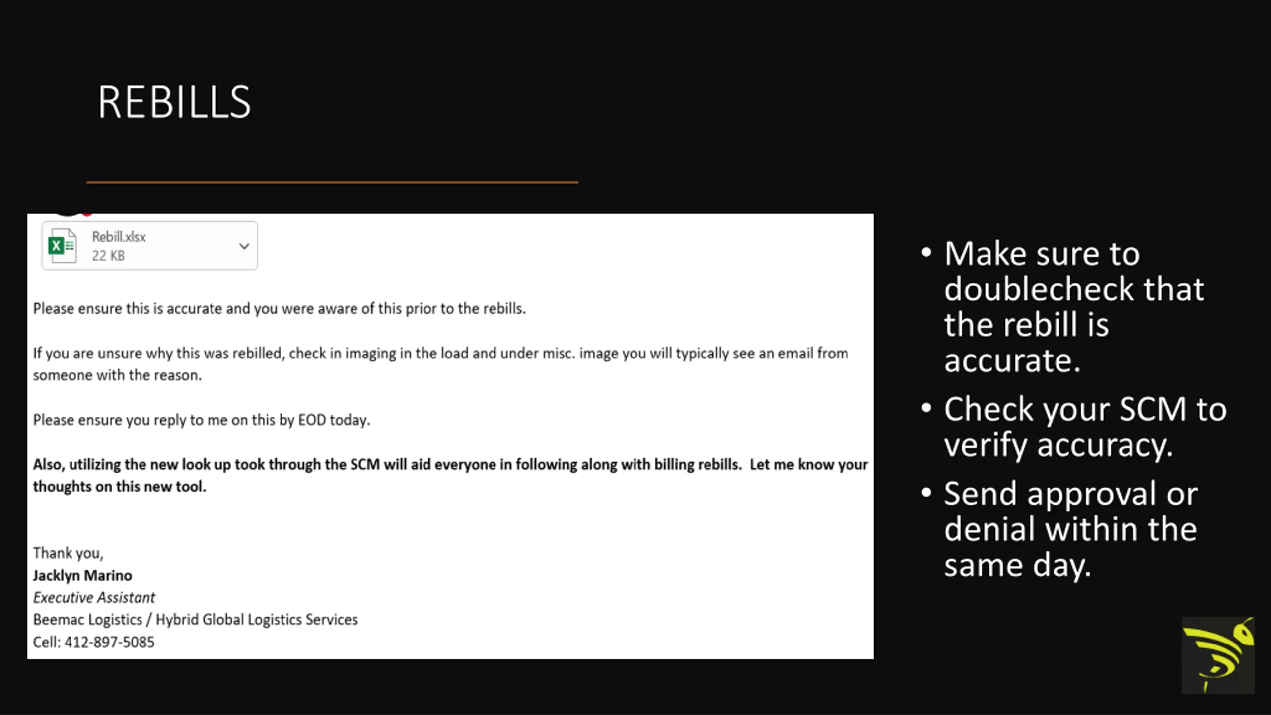 REBILLS Make sure to doublecheck that the rebill is accurate. Check your SCM to verify accuracy. Send approval or denial within the same day.