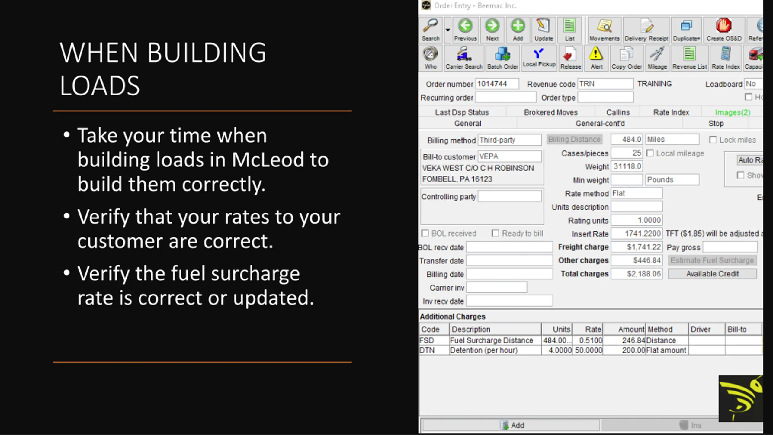 WHEN BUILDING LOADS Take your time when building loads in McLeod to build them correctly. Verify that your rates to your customer are correct. Verify the fuel surcharge rate is correct or updated.