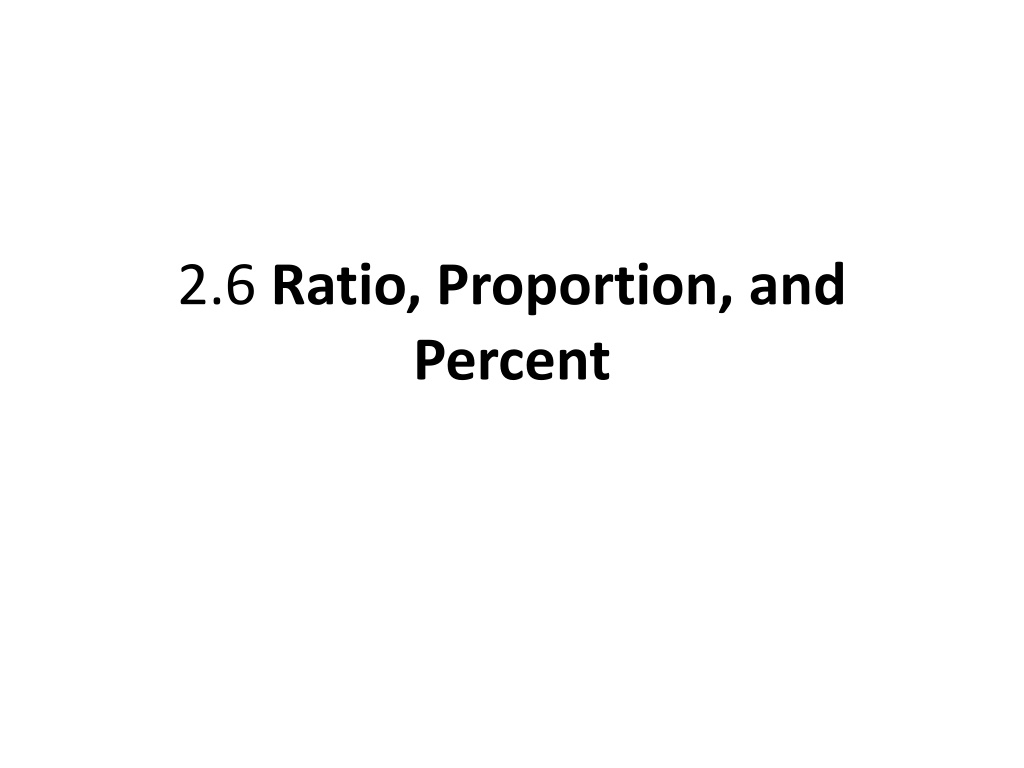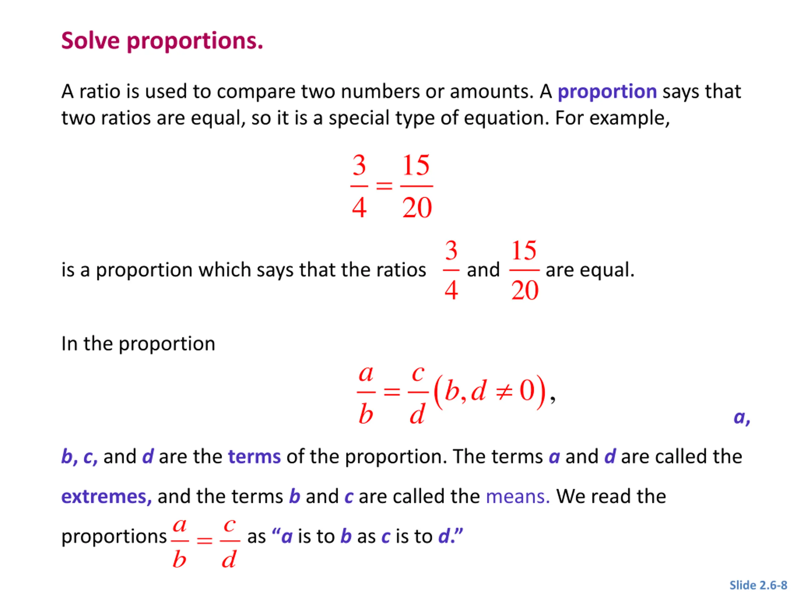 Solve proportions. A ratio is used to compare two numbers or amounts. A proportion says that two ratios are equal, so it is a special type of equation. For example, 3 4 15 20 = 3 4 15 20 is a proportion which says that the ratios and are equal. In the proportion a b c d ( ) = , 0 , b d a, b, c, and dare the terms of the proportion. The terms aandd are called the extremes, and the terms bandc are called the means. We read the a c b d proportions as ais to bas c is to d. = Slide 2.6-8