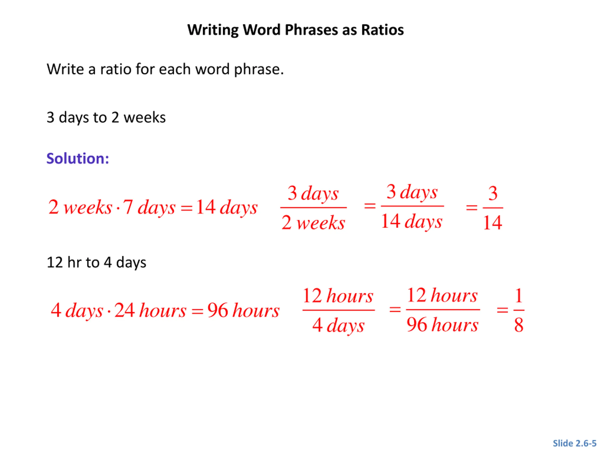 CLASSROOM EXAMPLE 1 Writing Word Phrases as Ratios Write a ratio for each word phrase. 3 days to 2 weeks Solution: 3 days days 3days weeks 3 = = weeks = days 2 7 14 days 14 14 12 hr to 4 days 12 96 hours hours 1 8 hours days = = days hours = hours 4 24 96 4 Slide 2.6-5