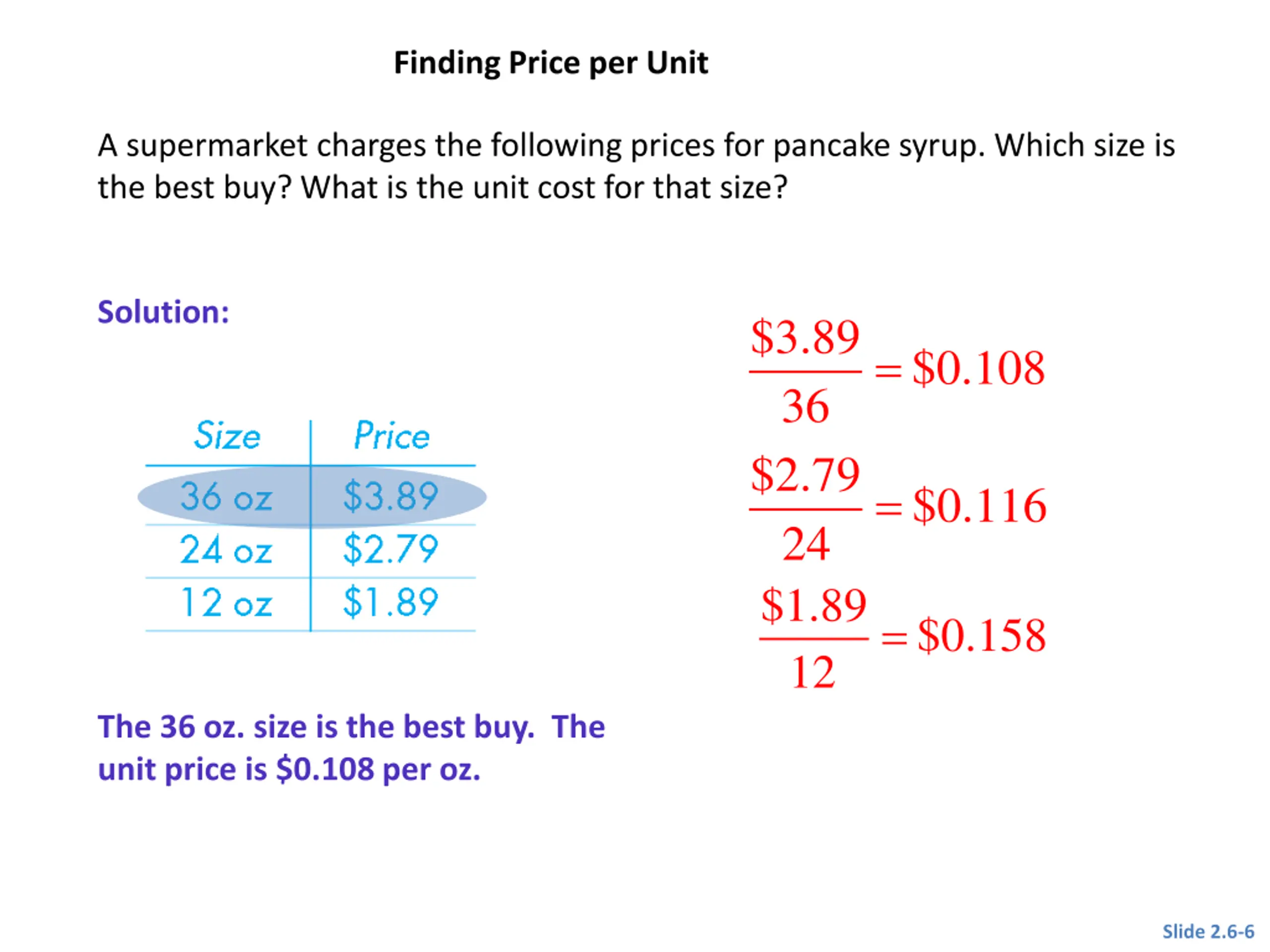 CLASSROOM EXAMPLE 2 Finding Price per Unit A supermarket charges the following prices for pancake syrup. Which size is the best buy? What is the unit cost for that size? Solution: $3.89 36 = $0.108 $2.79 24 $1.89 12 = $0.116 = $0.158 The 36 oz. size is the best buy. The unit price is $0.108 per oz. Slide 2.6-6