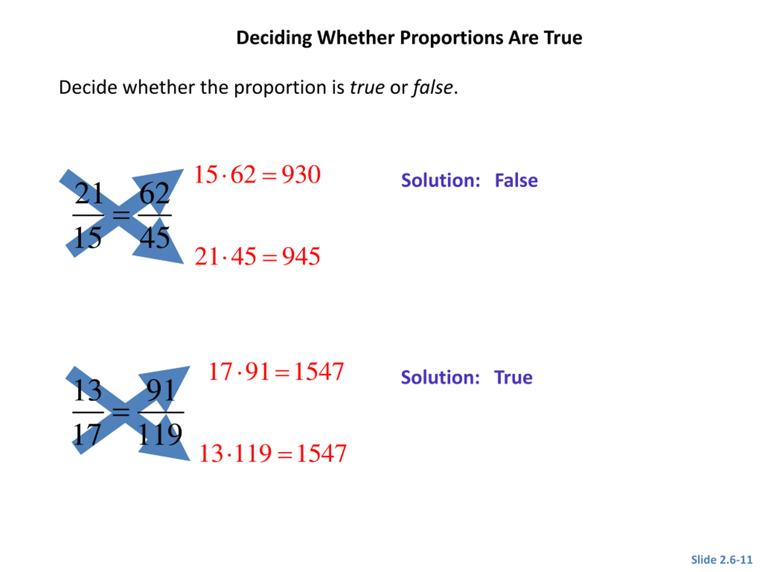 CLASSROOM EXAMPLE 3 Deciding Whether Proportions Are True Decide whether the proportion is true or false. 15 62 = 930 Solution: False 21 15 62 45 = 21 45 = 945 17 91 1547 = Solution: True 13 17 91 119 = 13 119 1547 = Slide 2.6-11