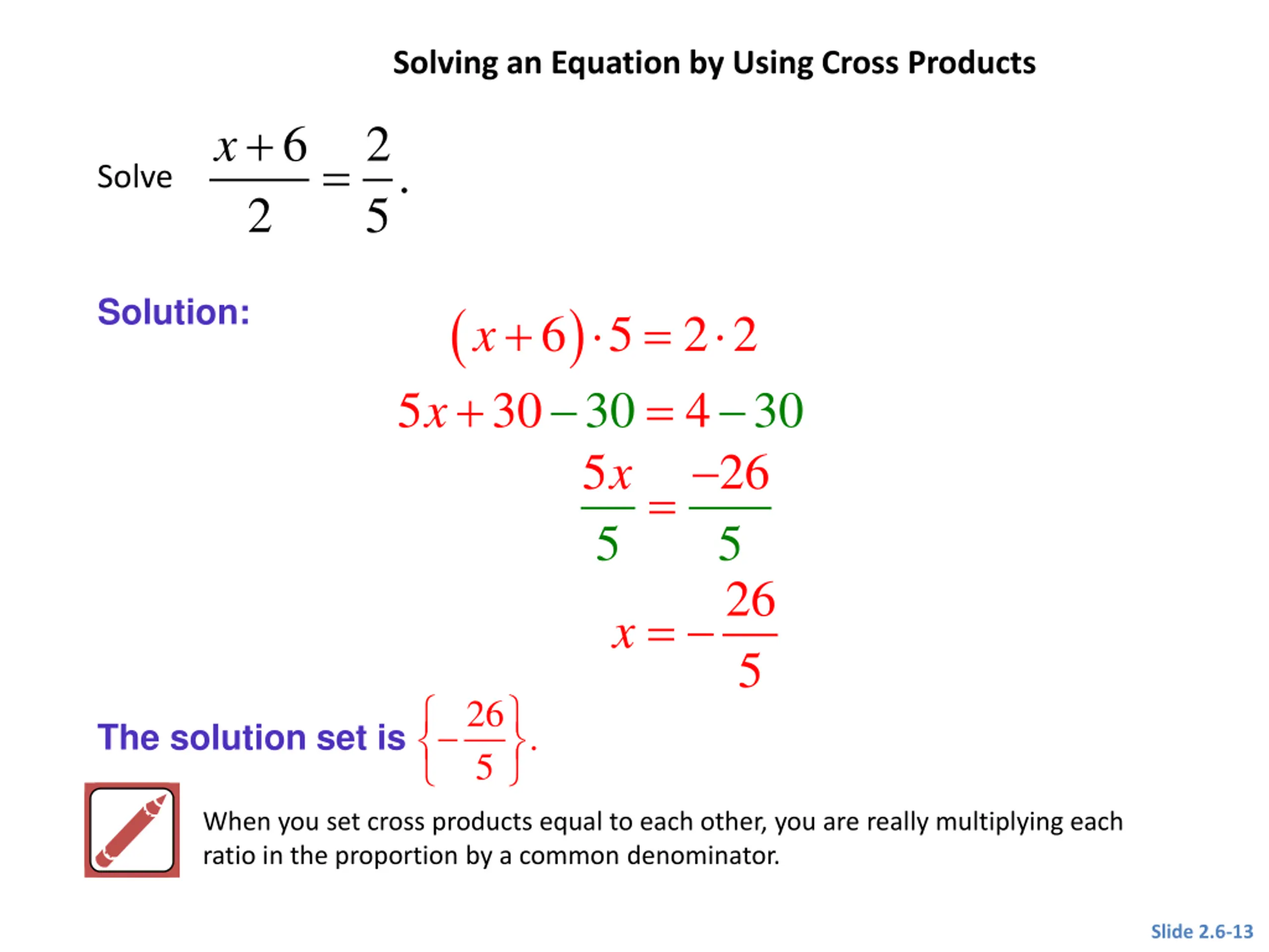 CLASSROOM EXAMPLE 5 Solving an Equation by Using Cross Products x+ 6 2. 5 = Solve 2 ( + ) 6 5 30 Solution: x+ = 30 5 5 2 2 4 = = 5 3 6 0 x 2 5 26 5 x x = 26 5 . The solution set is When you set cross products equal to each other, you are really multiplying each ratio in the proportion by a common denominator. Slide 2.6-13
