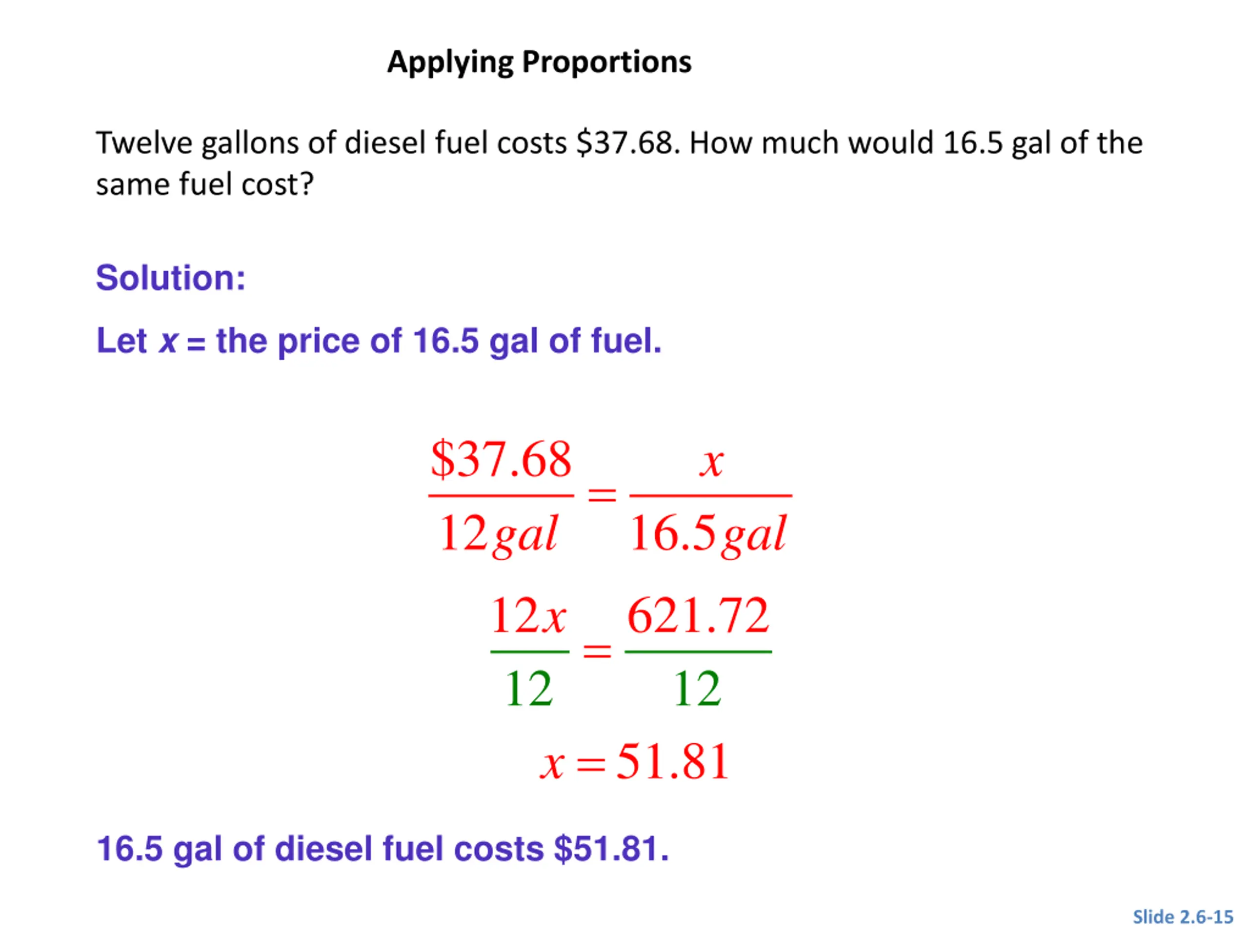 CLASSROOM EXAMPLE 6 Applying Proportions Twelve gallons of diesel fuel costs $37.68. How much would 16.5 gal of the same fuel cost? Solution: Let x = the price of 16.5 gal of fuel. $37.68 12 gal 12 x = 16.5 621. 12 51.81 gal 72 x= 12 x = 16.5 gal of diesel fuel costs $51.81. Slide 2.6-15