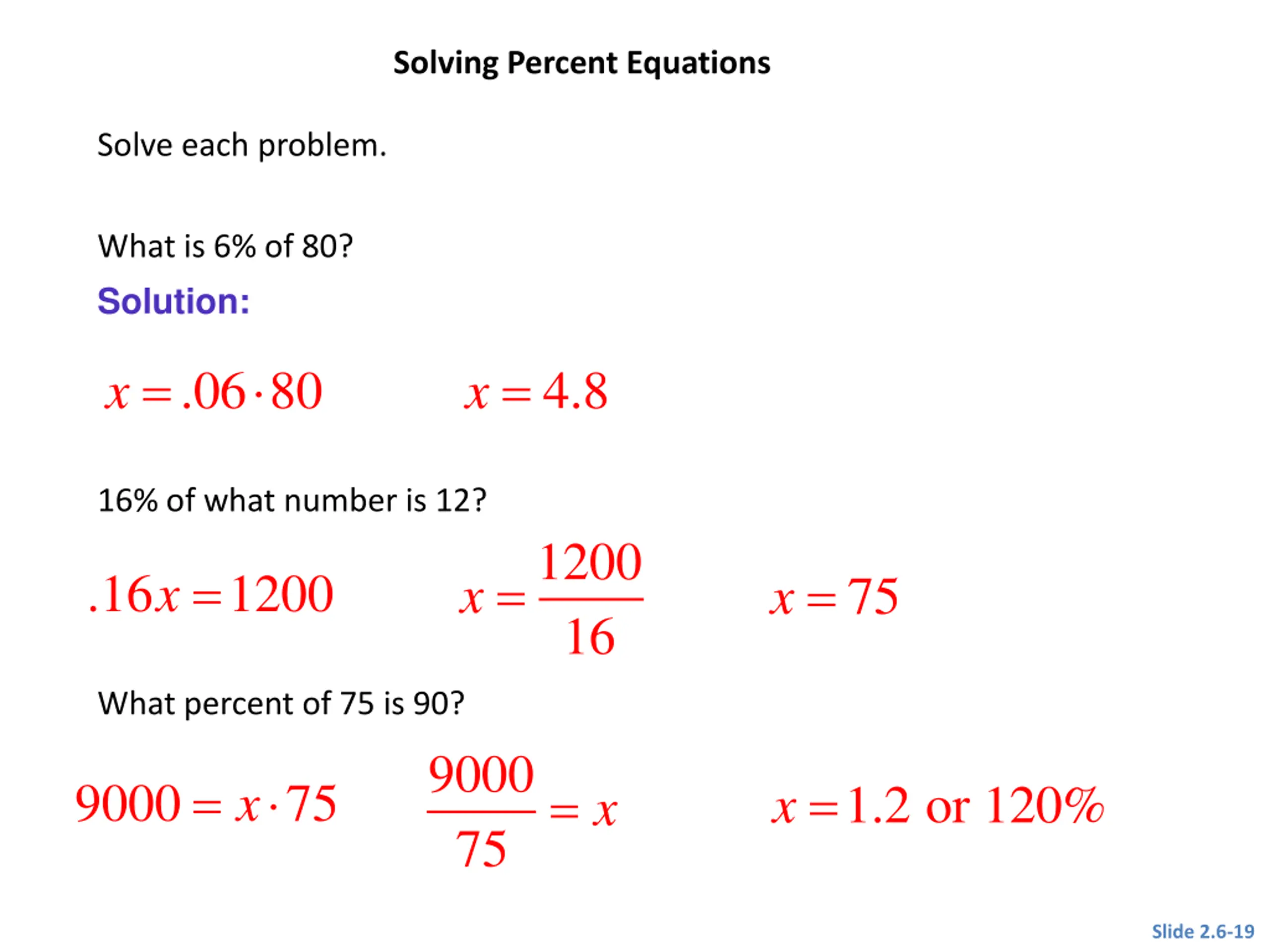 CLASSROOM EXAMPLE 8 Solving Percent Equations Solve each problem. What is 6% of 80? Solution: x = x = .06 80 4.8 16% of what number is 12? 1200 16 x = x = x = .16 1200 75 What percent of 75 is 90? 9000 75 = x = = 9000 75 x 1.2 or 120% x Slide 2.6-19