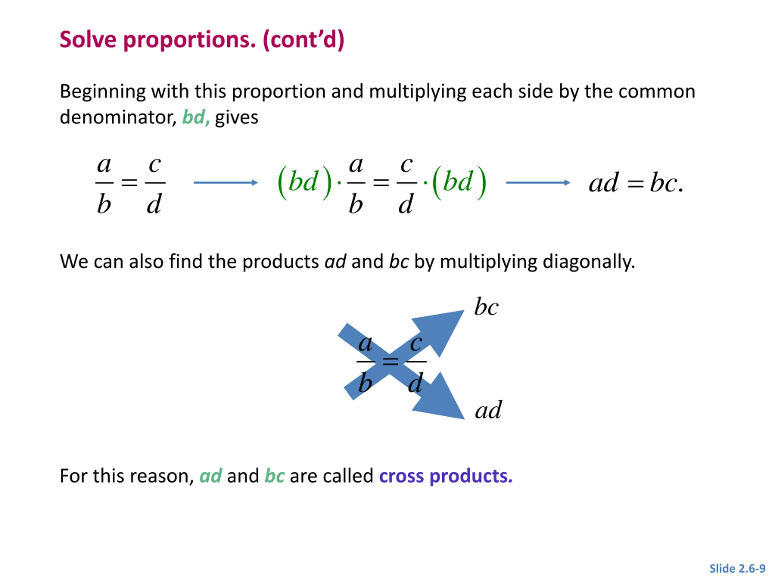 Solve proportions. (contd) Beginning with this proportion and multiplying each side by the common denominator, bd, gives a b c d a b c d ( ) ( ) = = = b d bd . ad bc We can also find the products ad and bc by multiplying diagonally. bc a b c d = ad For this reason, ad andbcare called cross products. Slide 2.6-9