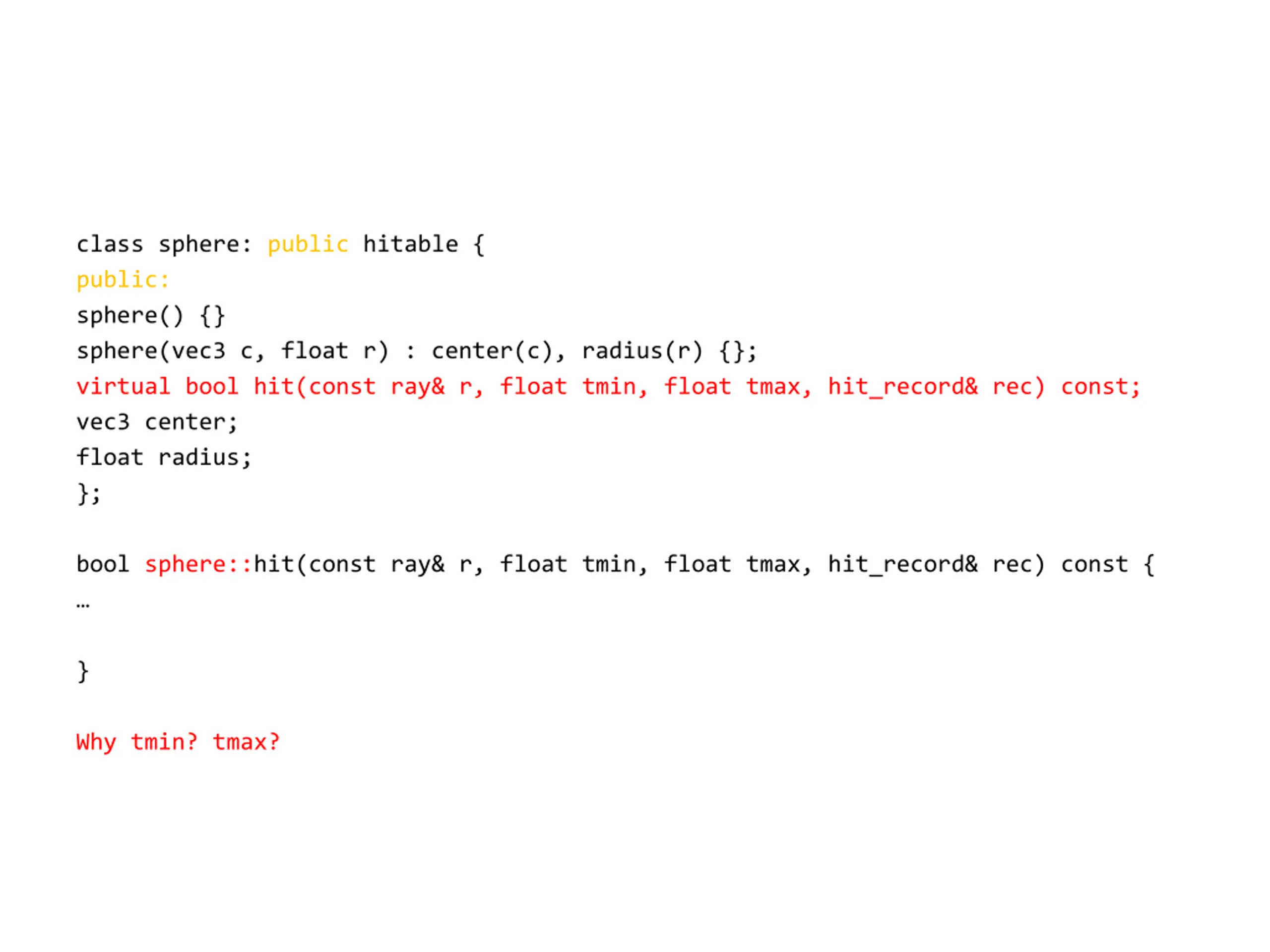 class sphere: public hitable { public: sphere() {} sphere(vec3 c, float r) : center(c), radius(r) {}; virtual bool hit(const ray& r, float tmin, float tmax, hit_record& rec) const; vec3 center; float radius; }; bool sphere::hit(const ray& r, float tmin, float tmax, hit_record& rec) const { } Why tmin? tmax?