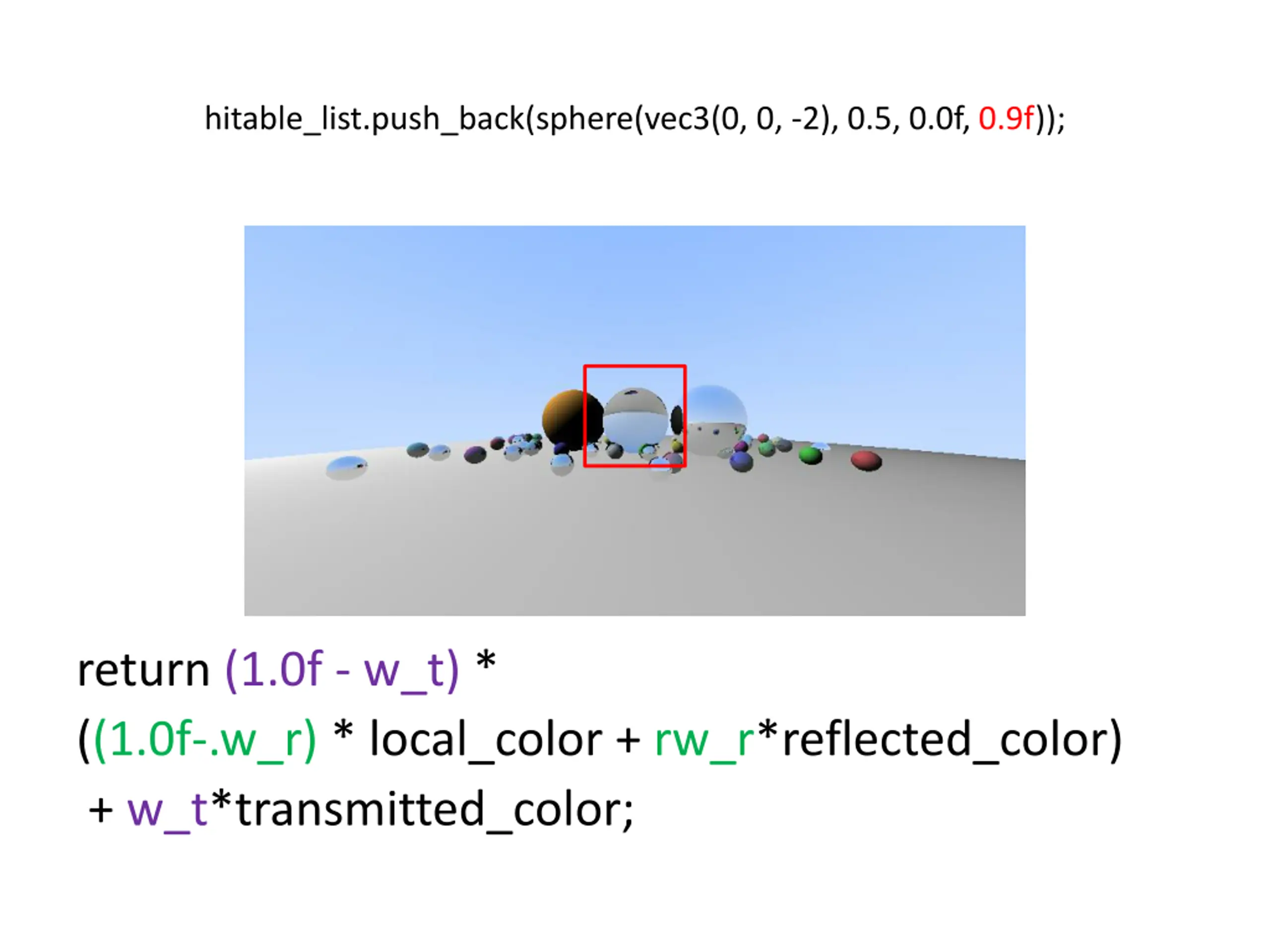 hitable_list.push_back(sphere(vec3(0, 0, -2), 0.5, 0.0f, 0.9f)); return (1.0f - w_t) * ((1.0f-.w_r) * local_color + rw_r*reflected_color) + w_t*transmitted_color;