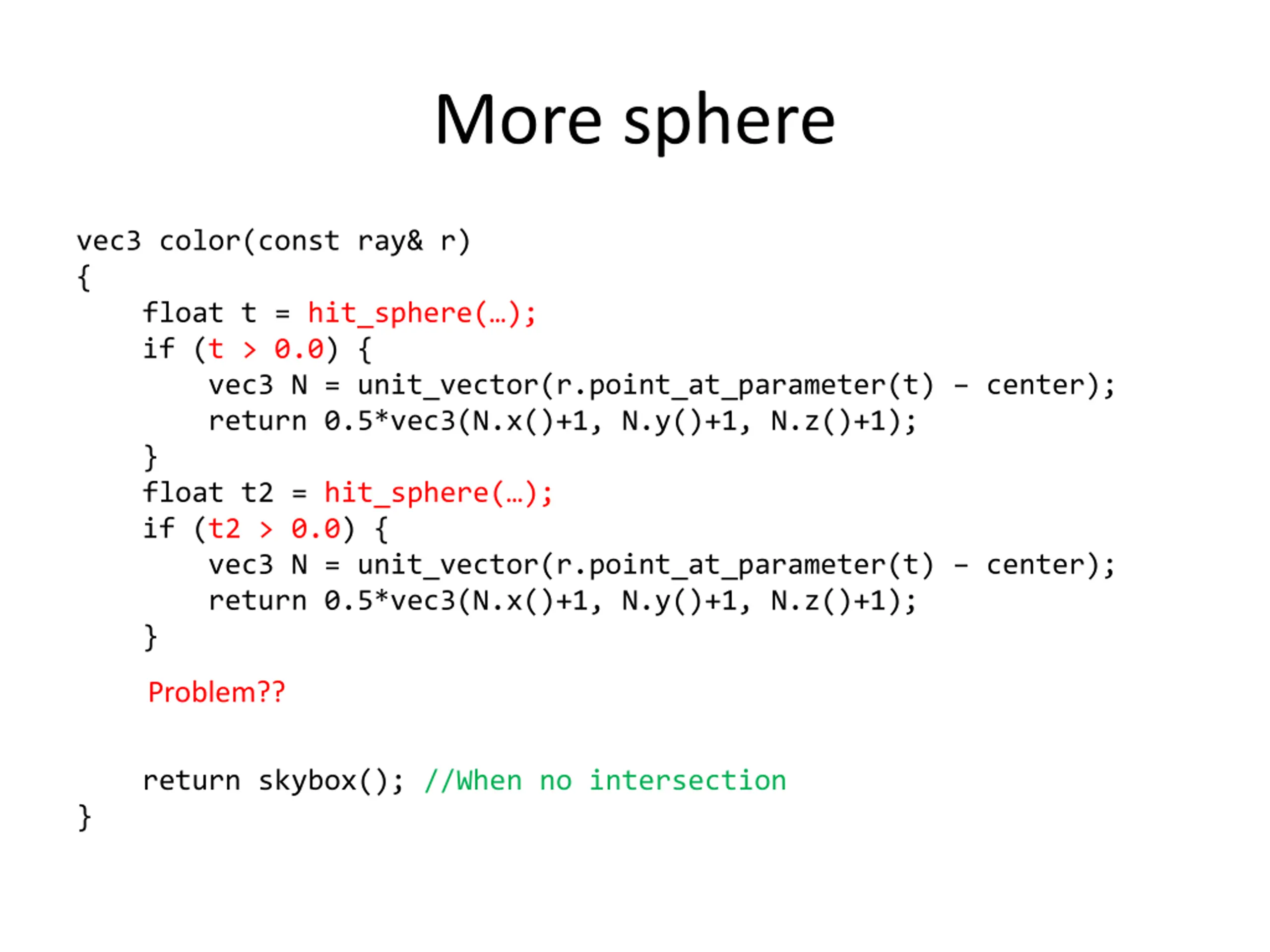 More sphere vec3 color(const ray& r) { float t = hit_sphere( ); if (t > 0.0) { vec3 N = unit_vector(r.point_at_parameter(t) center); return 0.5*vec3(N.x()+1, N.y()+1, N.z()+1); } float t2 = hit_sphere( ); if (t2 > 0.0) { vec3 N = unit_vector(r.point_at_parameter(t) center); return 0.5*vec3(N.x()+1, N.y()+1, N.z()+1); } Problem?? return skybox(); //When no intersection }