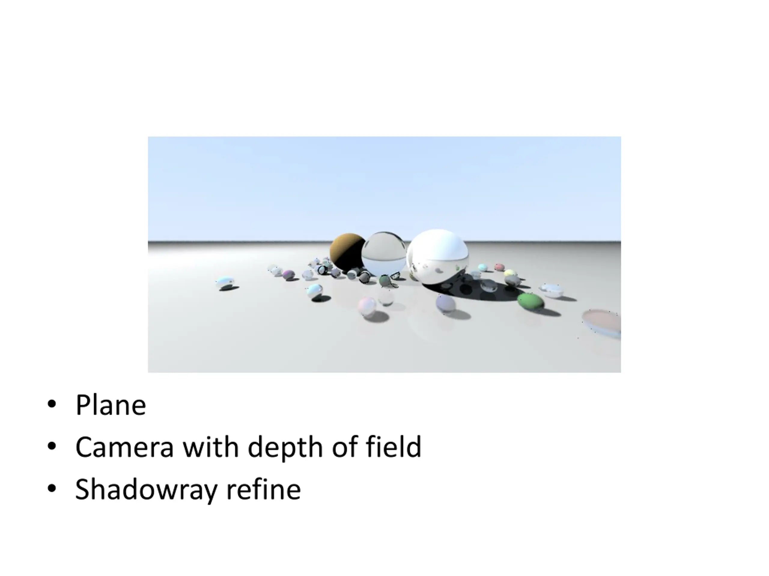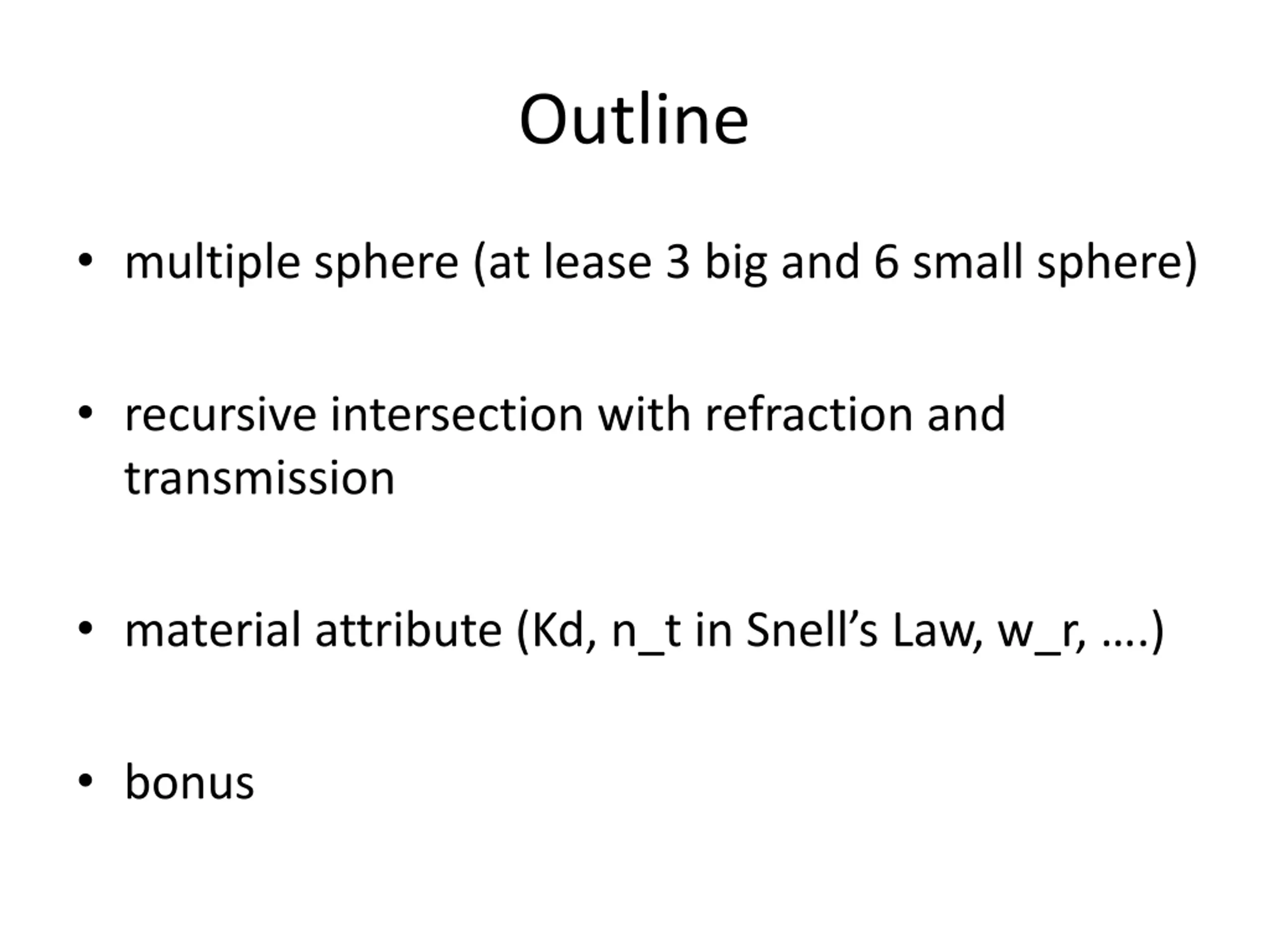 Outline multiple sphere (at lease 3 big and 6 small sphere) recursive intersection with refraction and transmission material attribute (Kd, n_t in Snell s Law, w_r, .) bonus