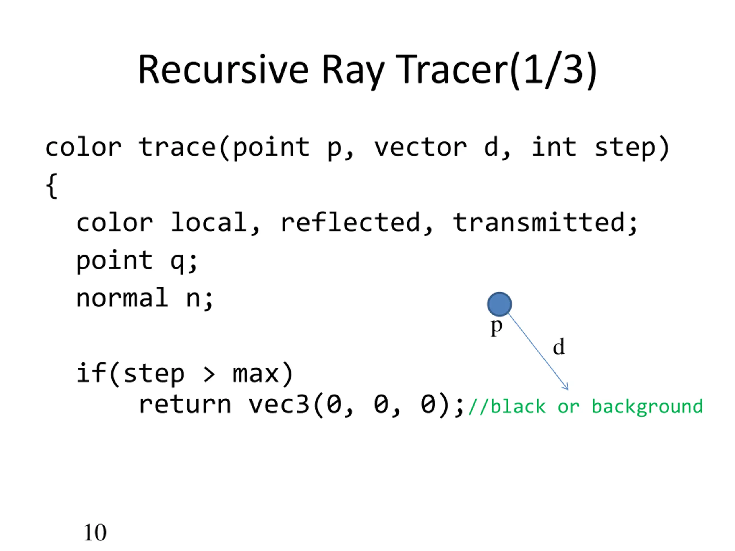 Recursive Ray Tracer(1/3) color trace(point p, vector d, int step) { color local, reflected, transmitted; point q; normal n; p d if(step > max) return vec3(0, 0, 0);//black or background 10