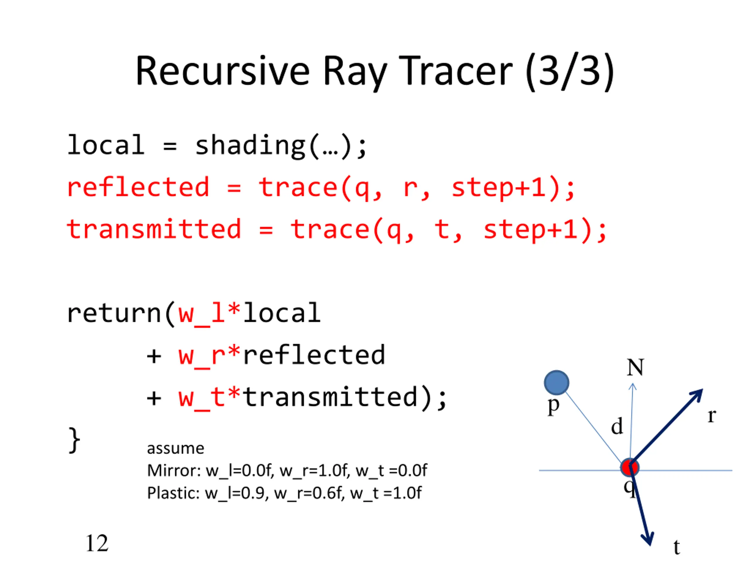 Recursive Ray Tracer (2/3) N p r q = intersect(p, d, status); d q //if(status==light_source) //return(light_source_color); if(status==no_intersection) return(background_color); t n = normal(q); //or get from hit_record r = reflect(q, n); t = transmit(q, n); 11