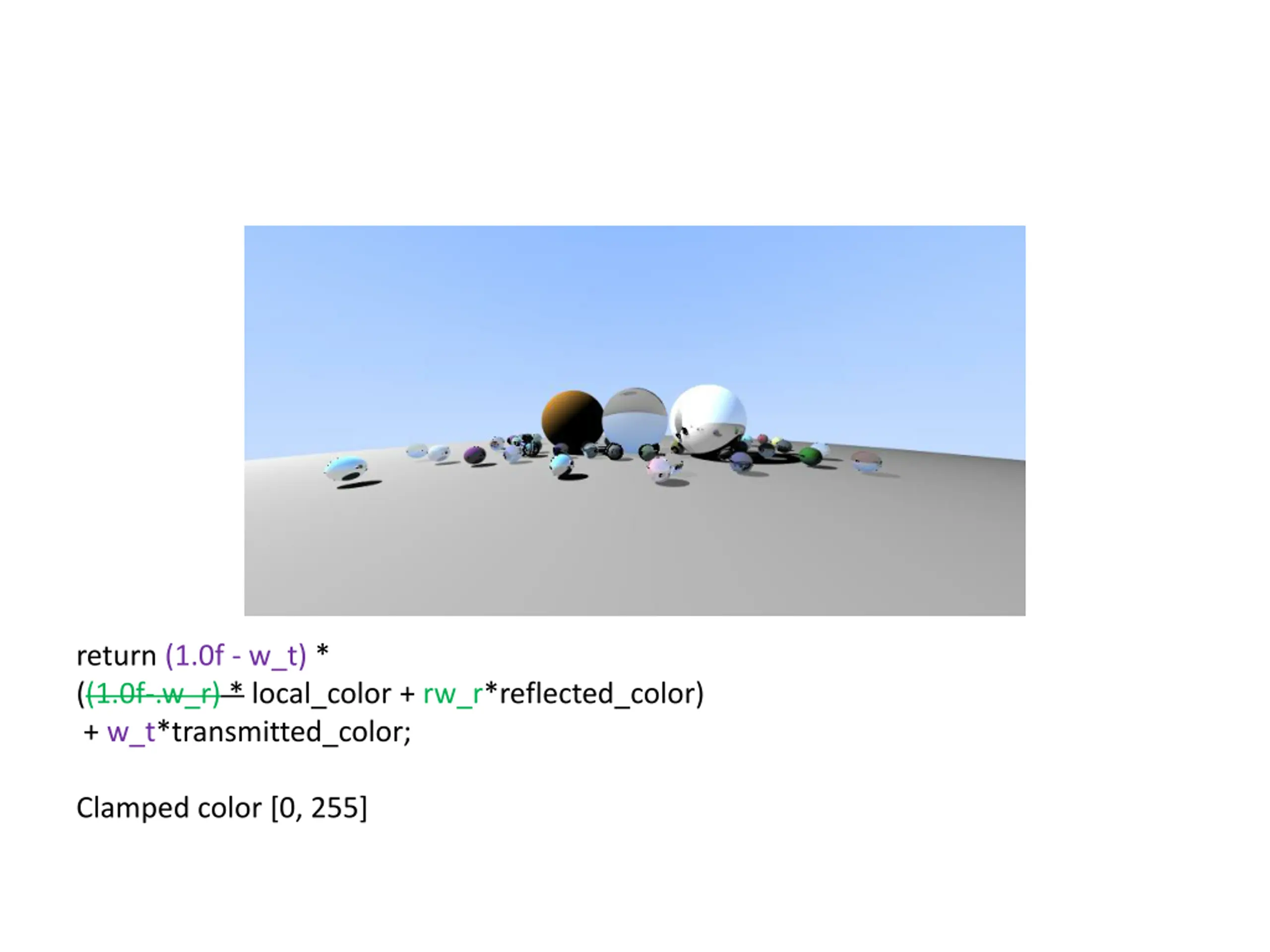 return (1.0f - w_t) * ((1.0f-.w_r) * local_color + rw_r*reflected_color) + w_t*transmitted_color; Clamped color [0, 255]