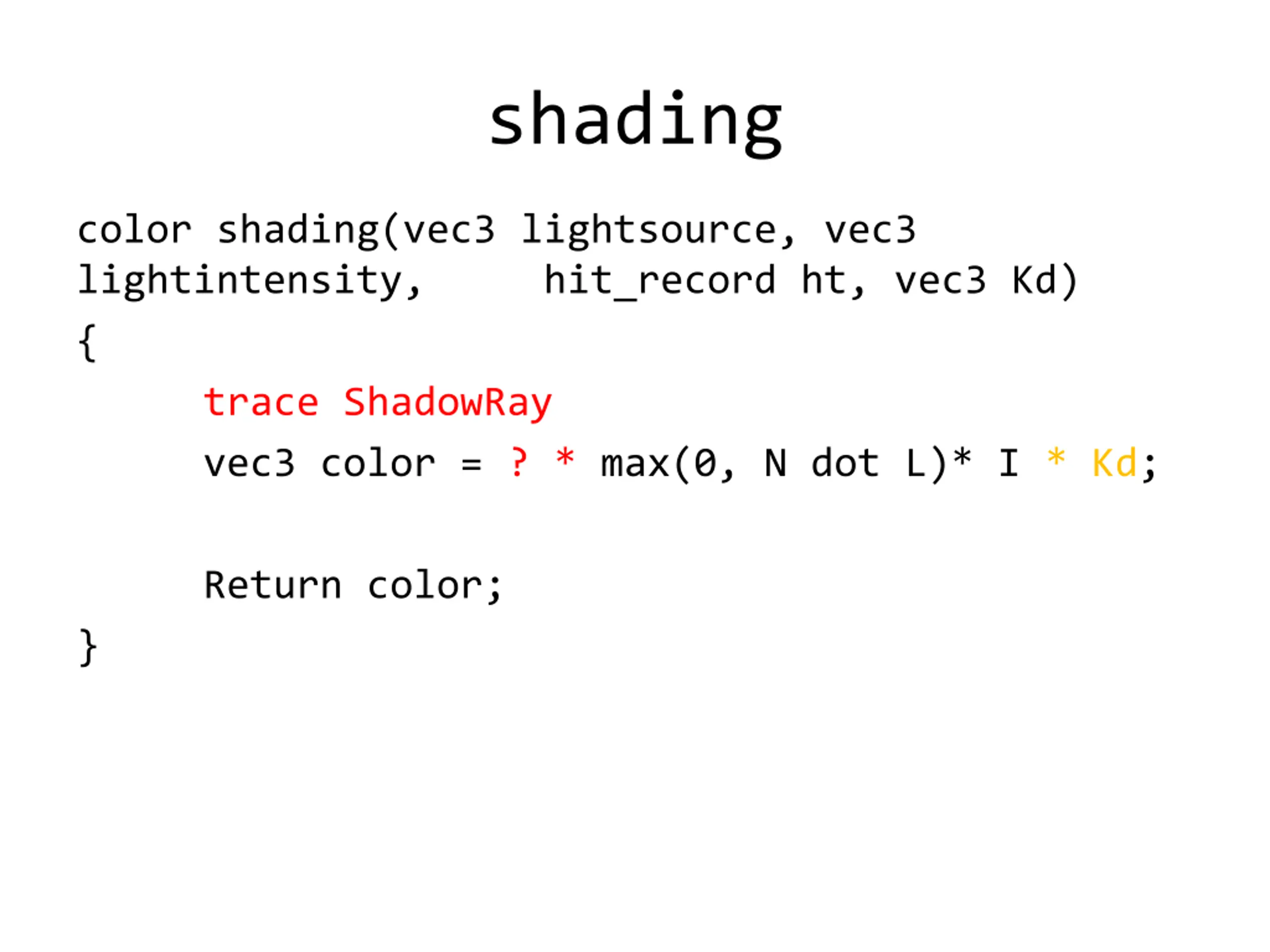 shading color shading(vec3 lightsource, vec3 lightintensity, { trace ShadowRay vec3 color = ? * max(0, N dot L)* I * Kd; hit_record ht, vec3 Kd) Return color; }