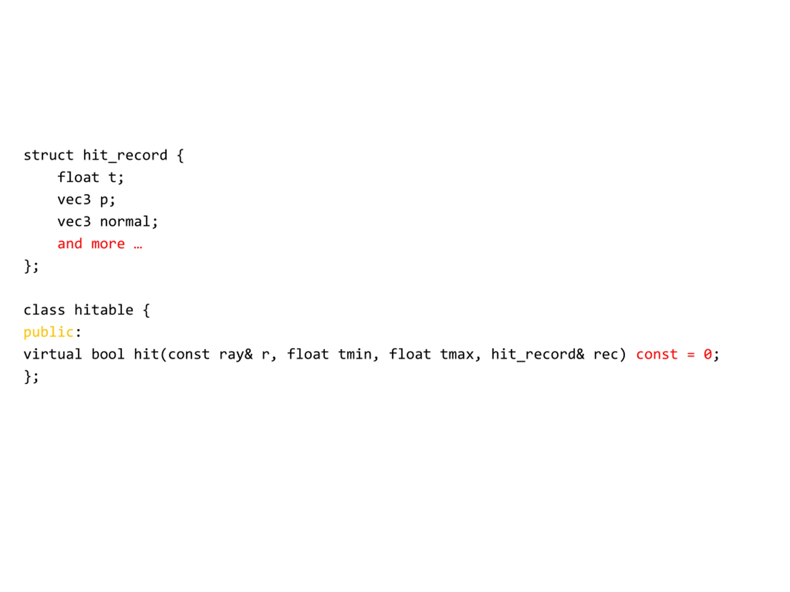 struct hit_record { float t; vec3 p; vec3 normal; and more }; class hitable { public: virtual bool hit(const ray& r, float tmin, float tmax, hit_record& rec) const = 0; };