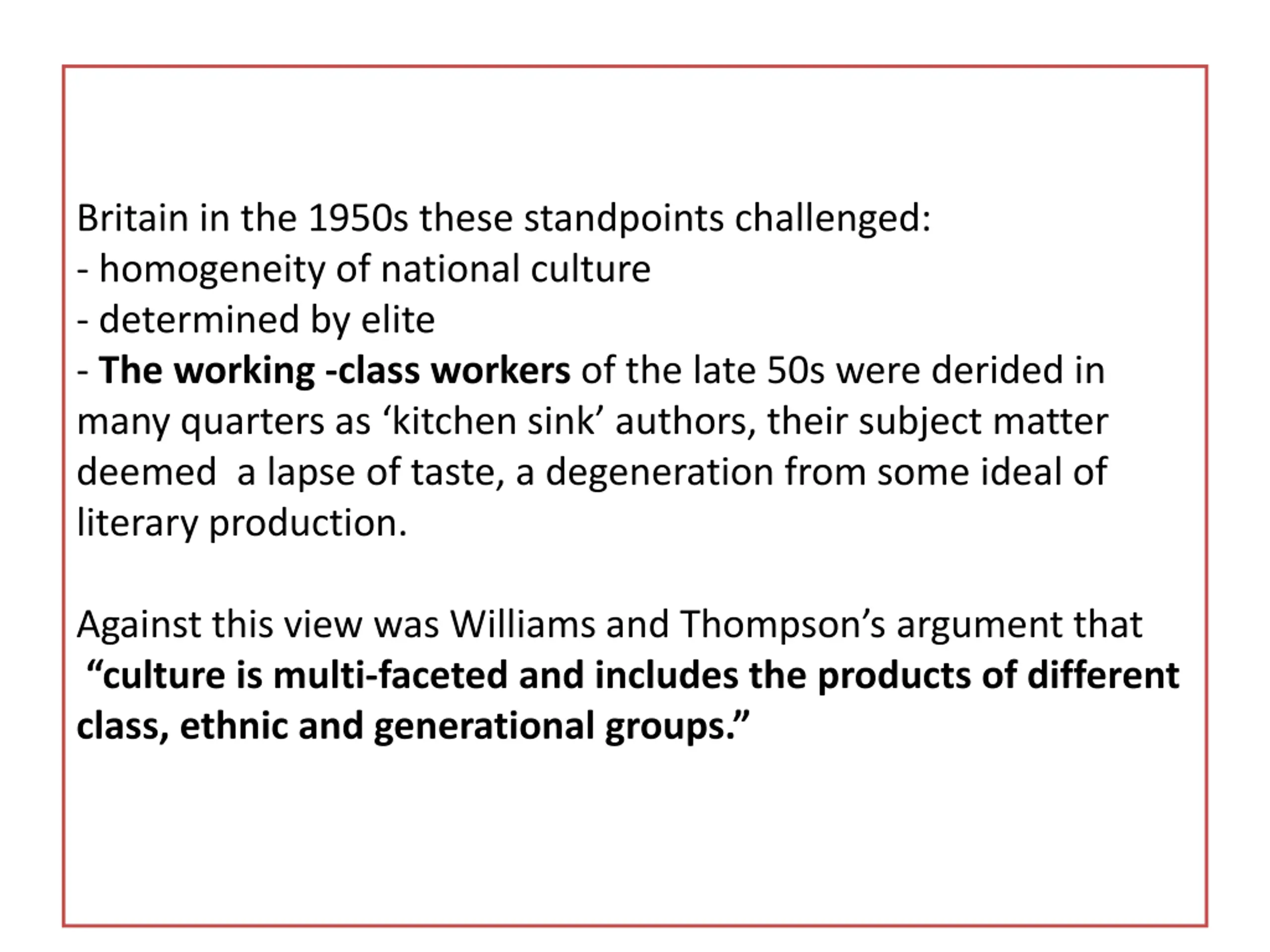 Britain in the 1950s these standpoints challenged: - homogeneity of national culture - determined by elite - The working -class workers of the late 50s were derided in many quarters as kitchen sink authors, their subject matter deemed a lapse of taste, a degeneration from some ideal of literary production. Against this view was Williams and Thompson s argument that culture is multi-faceted and includes the products of different class, ethnic and generational groups.
