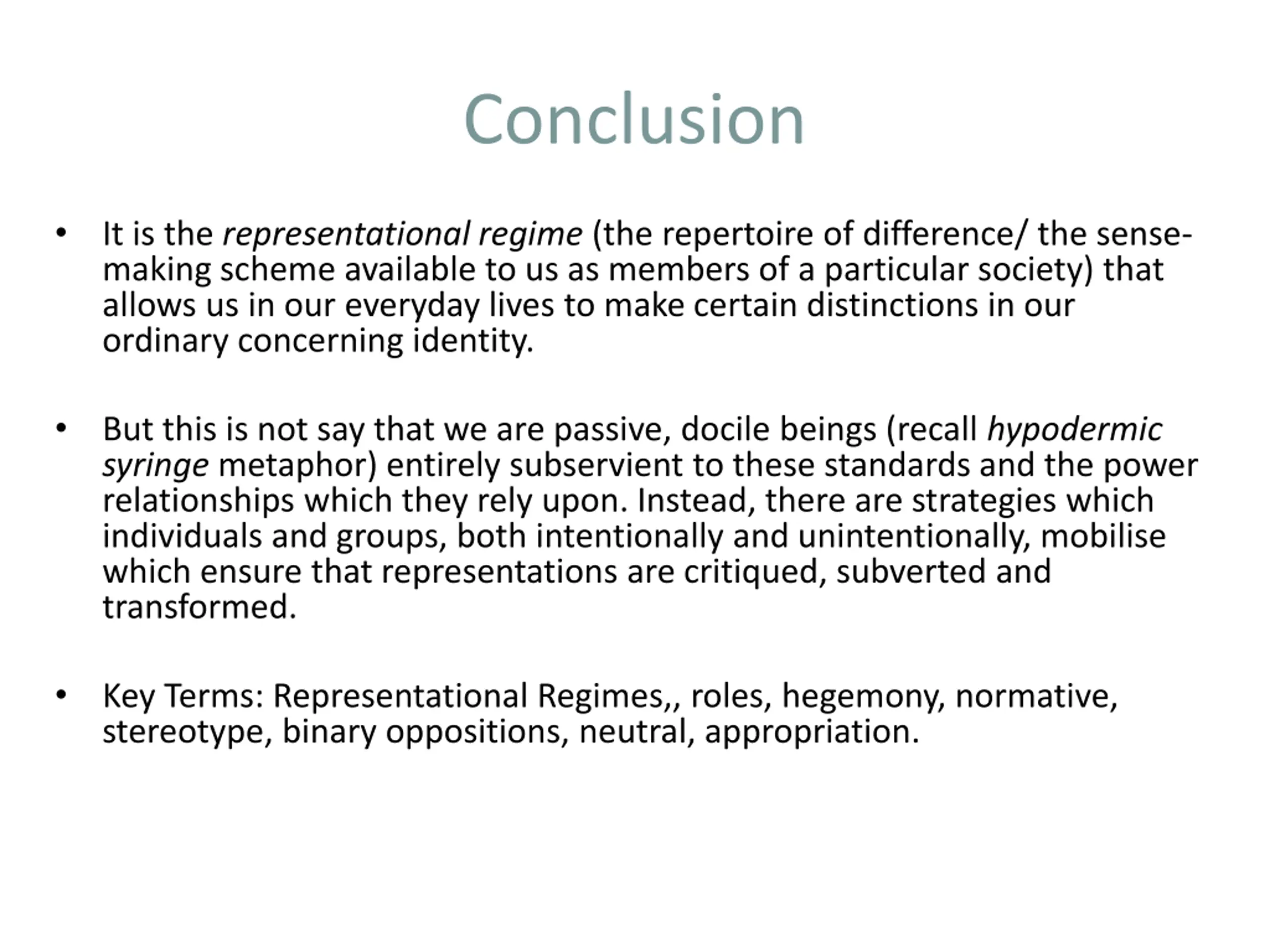 Conclusion It is the representational regime (the repertoire of difference/ the sense- making scheme available to us as members of a particular society) that allows us in our everyday lives to make certain distinctions in our ordinary concerning identity. But this is not say that we are passive, docile beings (recall hypodermic syringe metaphor) entirely subservient to these standards and the power relationships which they rely upon. Instead, there are strategies which individuals and groups, both intentionally and unintentionally, mobilise which ensure that representations are critiqued, subverted and transformed. Key Terms: Representational Regimes,, roles, hegemony, normative, stereotype, binary oppositions, neutral, appropriation.