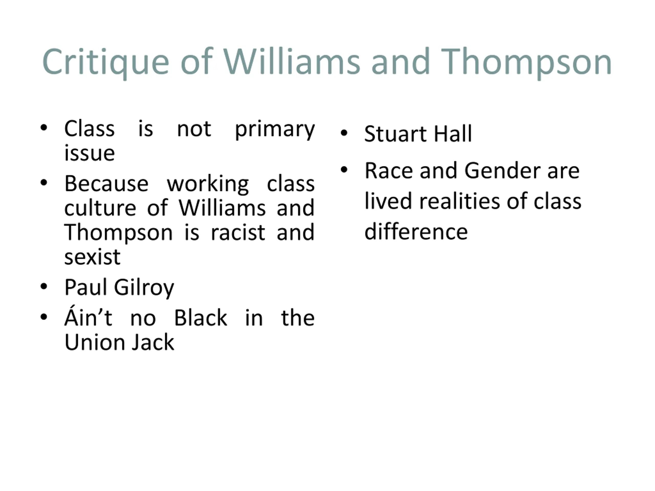 Critique of Williams and Thompson Class is not primary issue Because working class culture of Williams and Thompson is racist and sexist Paul Gilroy in t no Black in the Union Jack Stuart Hall Race and Gender are lived realities of class difference