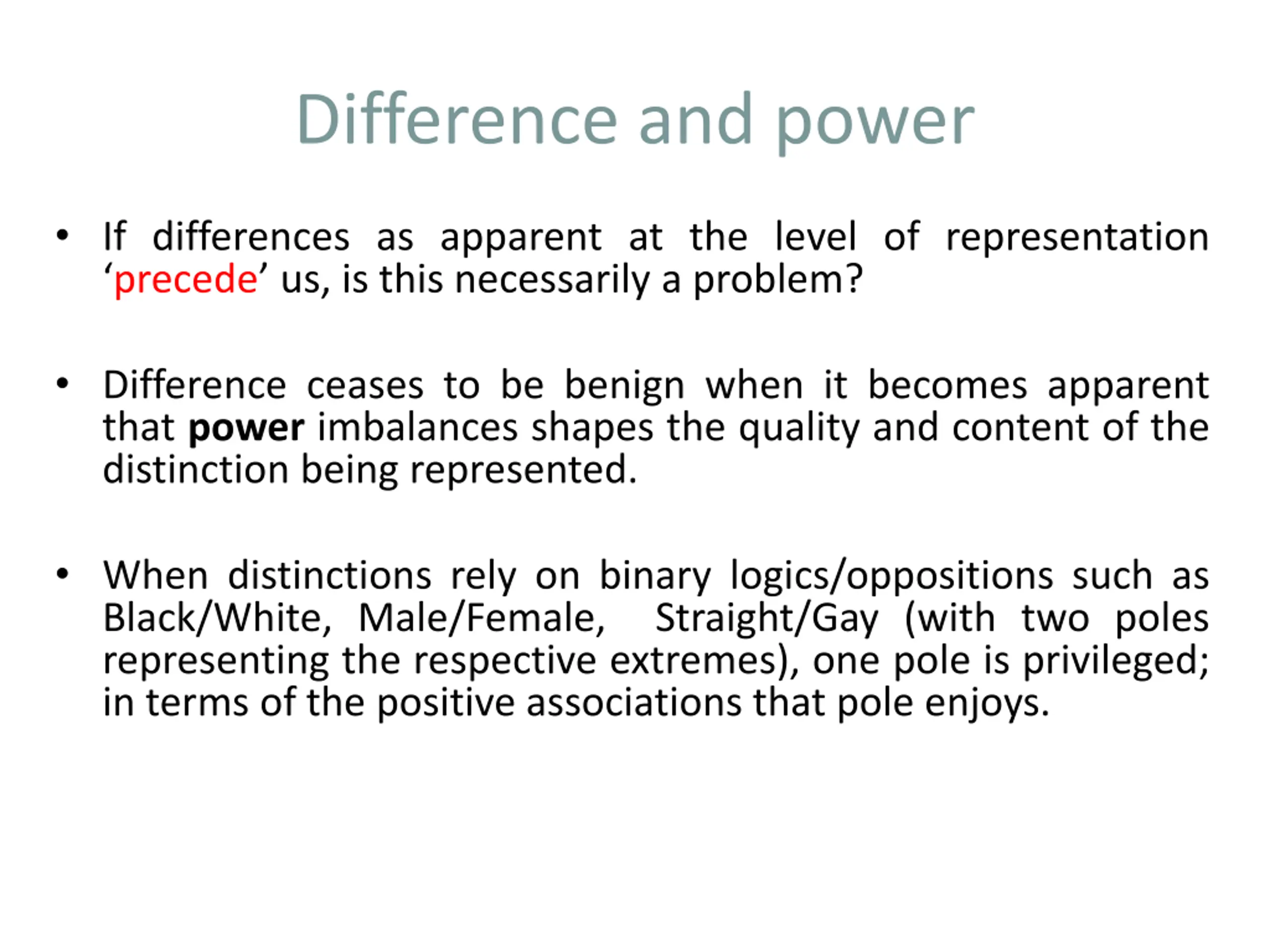 Difference and power If differences as apparent at the level of representation precede us, is this necessarily a problem? Difference ceases to be benign when it becomes apparent that power imbalances shapes the quality and content of the distinction being represented. When distinctions rely on binary logics/oppositions such as Black/White, Male/Female, representing the respective extremes), one pole is privileged; in terms of the positive associations that pole enjoys. Straight/Gay (with two poles