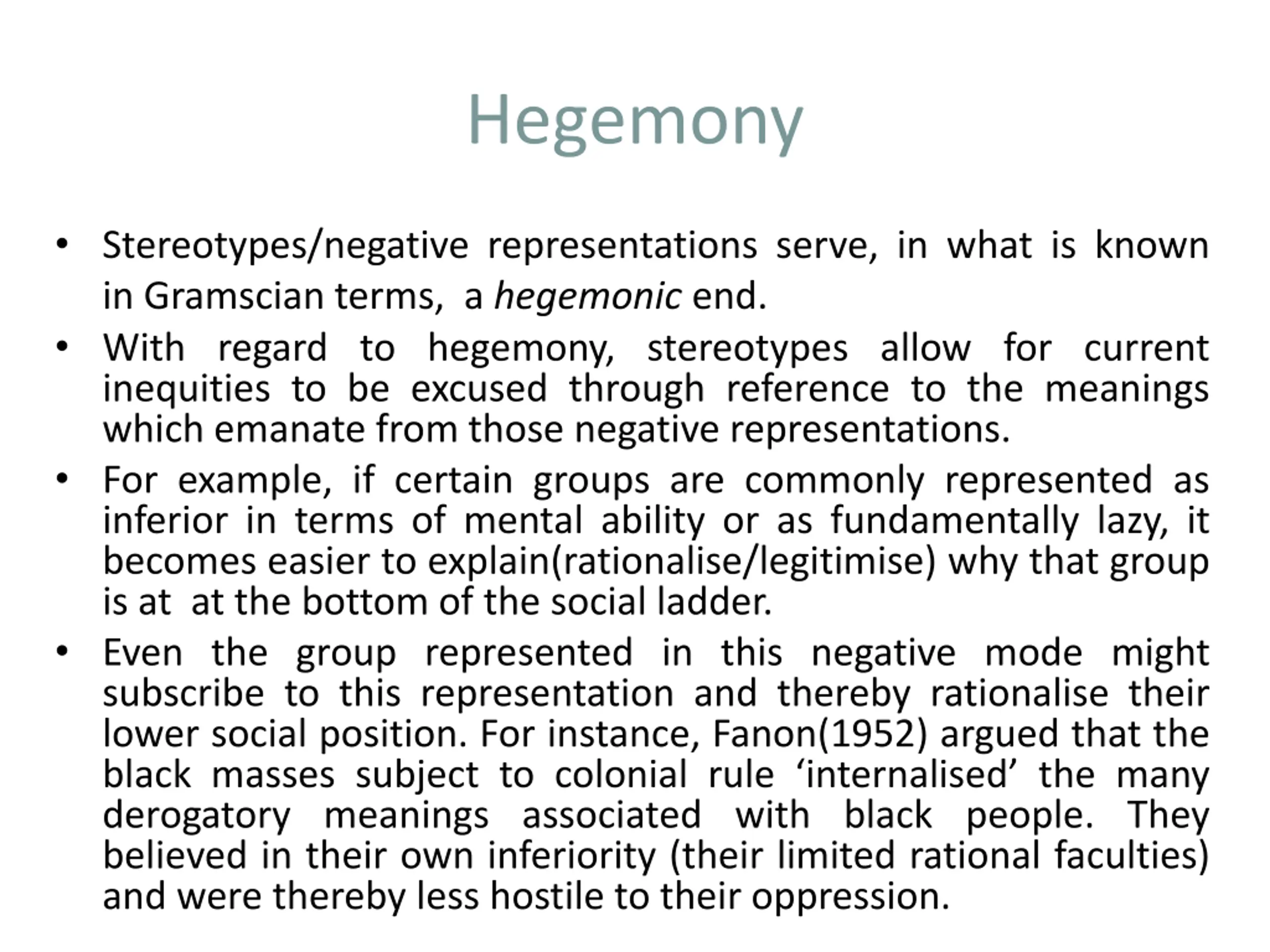 Hegemony Stereotypes/negative representations serve, in what is known in Gramscian terms, a hegemonic end. With regard to hegemony, stereotypes allow for current inequities to be excused through reference to the meanings which emanate from those negative representations. For example, if certain groups are commonly represented as inferior in terms of mental ability or as fundamentally lazy, it becomes easier to explain(rationalise/legitimise) why that group is at at the bottom of the social ladder. Even the group represented in this negative mode might subscribe to this representation and thereby rationalise their lower social position. For instance, Fanon(1952) argued that the black masses subject to colonial rule internalised the many derogatory meanings associated with black people. They believed in their own inferiority (their limited rational faculties) and were thereby less hostile to their oppression.