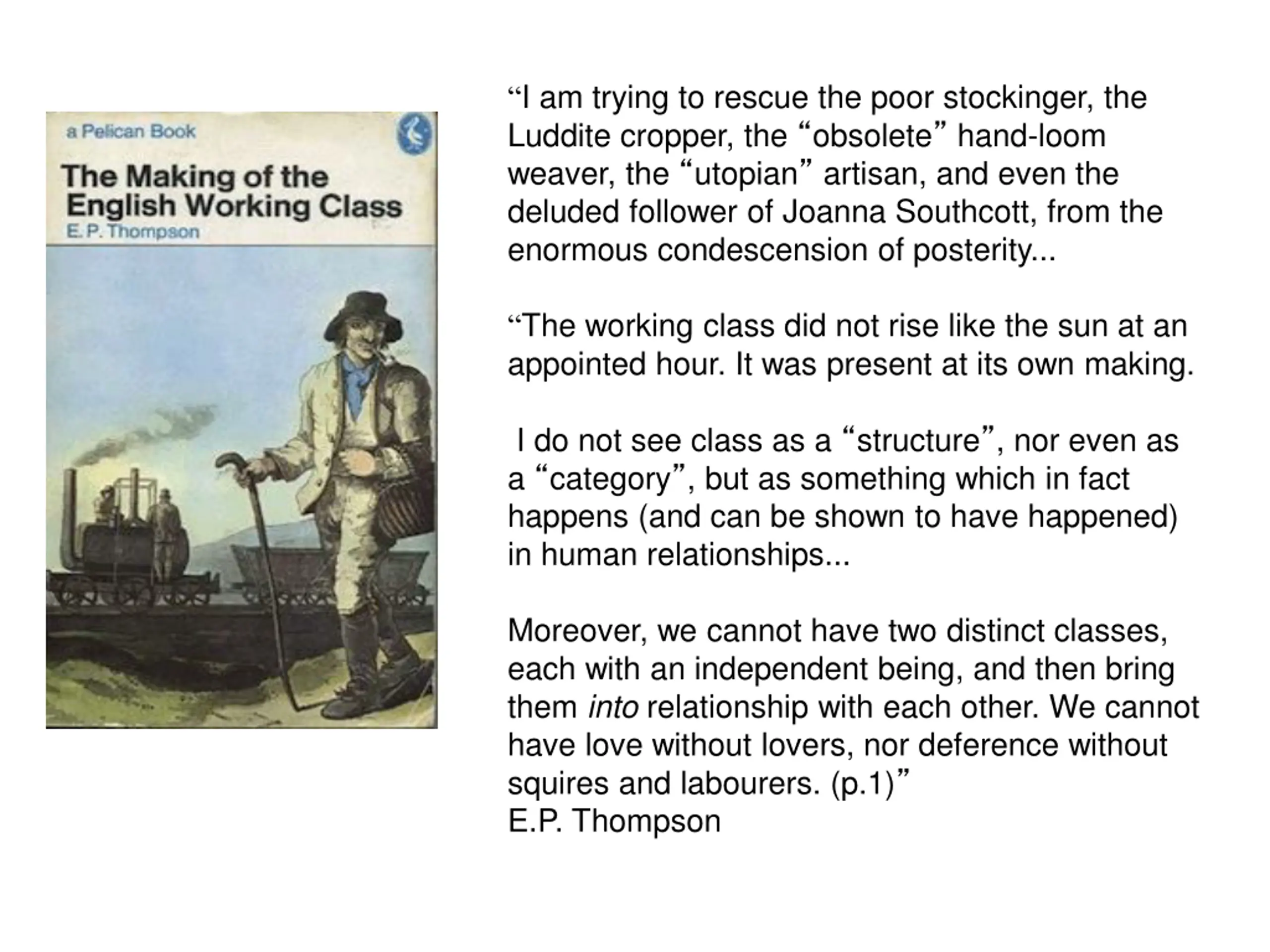 I am trying to rescue the poor stockinger, the Luddite cropper, the obsolete hand-loom weaver, the utopian artisan, and even the deluded follower of Joanna Southcott, from the enormous condescension of posterity... The working class did not rise like the sun at an appointed hour. It was present at its own making. I do not see class as a structure , nor even as a category , but as something which in fact happens (and can be shown to have happened) in human relationships... Moreover, we cannot have two distinct classes, each with an independent being, and then bring them into relationship with each other. We cannot have love without lovers, nor deference without squires and labourers. (p.1) E.P. Thompson