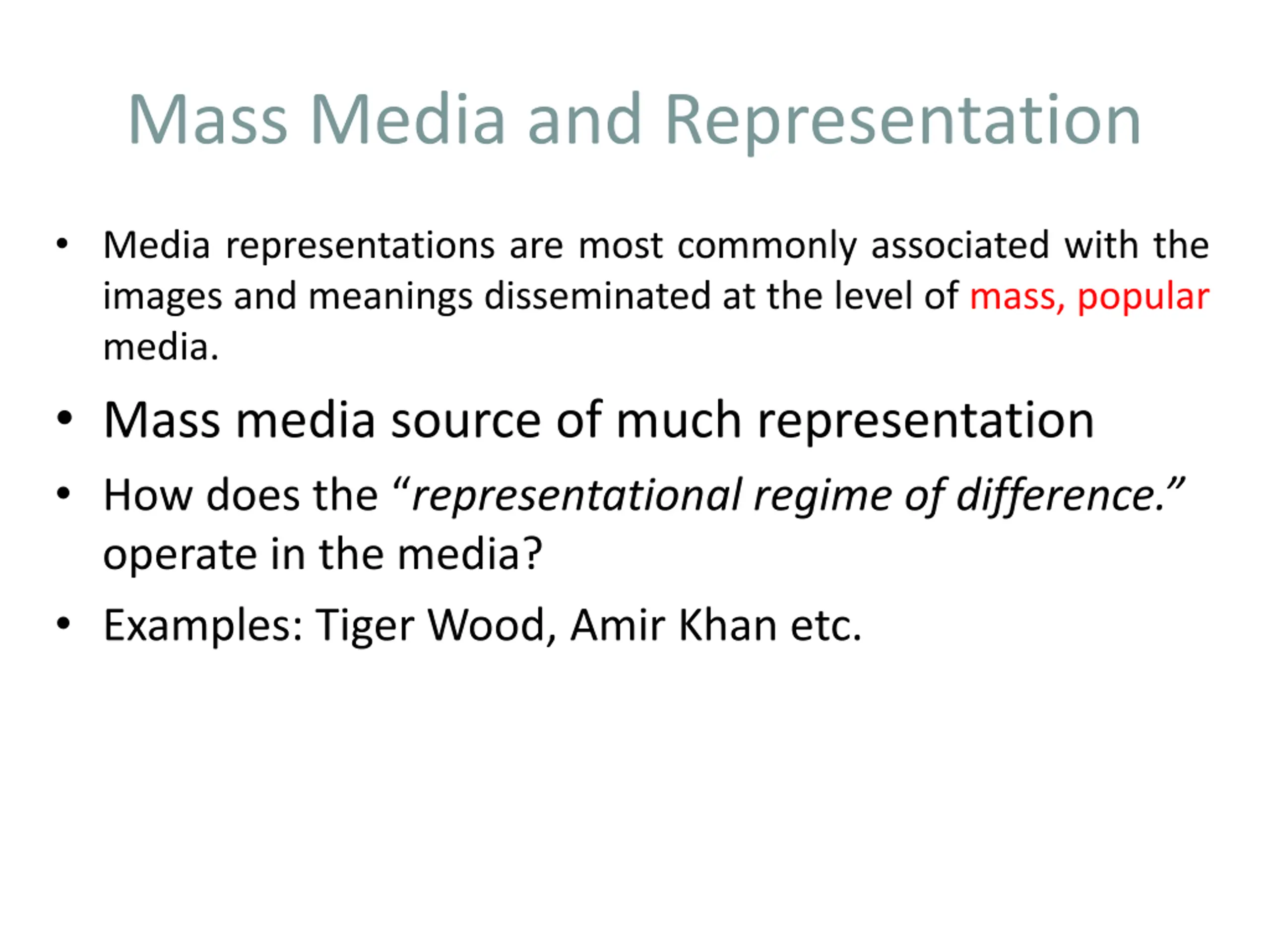 Mass Media and Representation Media representations are most commonly associated with the images and meanings disseminated at the level of mass, popular media. Mass media source of much representation How does the representational regime of difference. operate in the media? Examples: Tiger Wood, Amir Khan etc.