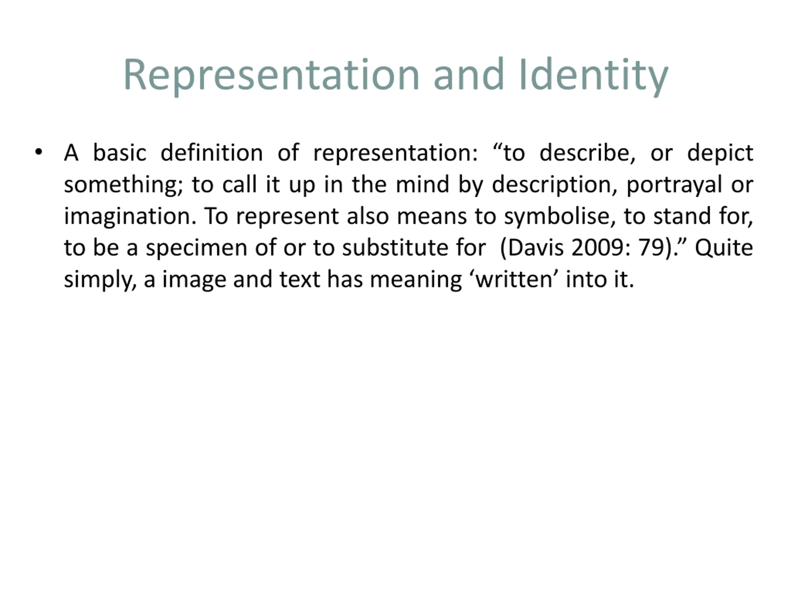 Representation and Identity A basic definition of representation: to describe, or depict something; to call it up in the mind by description, portrayal or imagination. To represent also means to symbolise, to stand for, to be a specimen of or to substitute for (Davis 2009: 79). Quite simply, a image and text has meaning written into it.