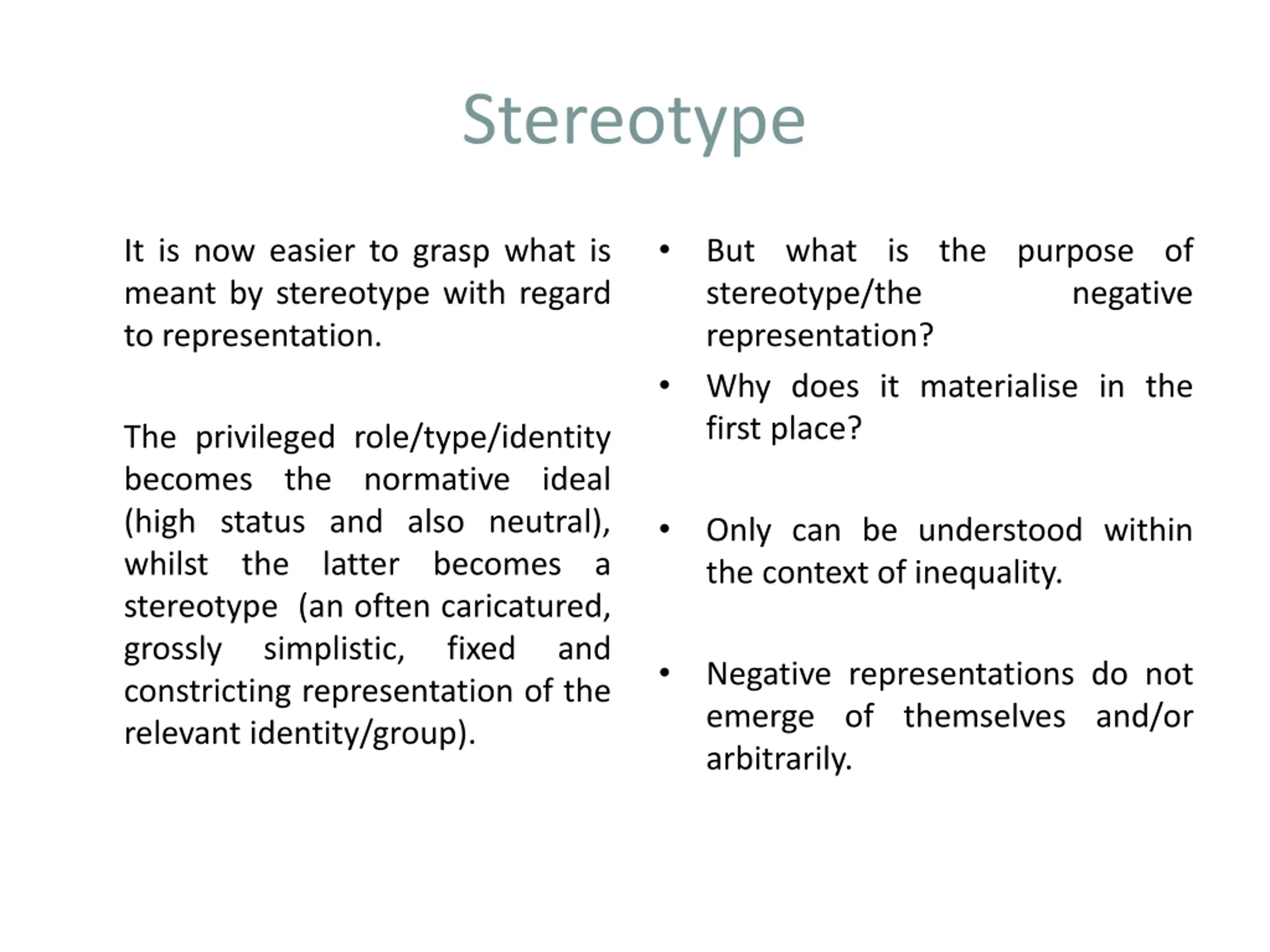 Stereotype It is now easier to grasp what is meant by stereotype with regard to representation. But what is the purpose of stereotype/the representation? Why does it materialise in the first place? negative The privileged role/type/identity becomes the normative ideal (high status and also neutral), whilst the latter stereotype (an often caricatured, grossly simplistic, constricting representation of the relevant identity/group). Only can be understood within the context of inequality. becomes a fixed and Negative representations do not emerge of themselves and/or arbitrarily.