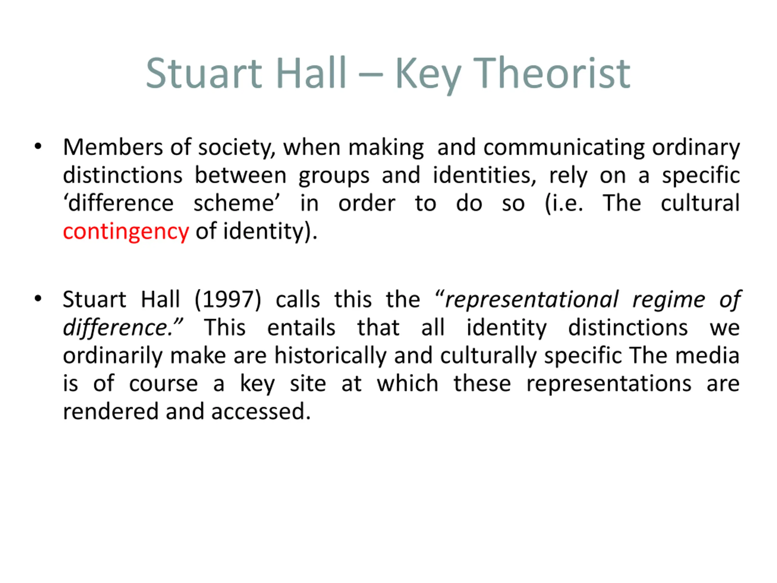 Stuart Hall Key Theorist Members of society, when making and communicating ordinary distinctions between groups and identities, rely on a specific difference scheme in order to do so (i.e. The cultural contingency of identity). Stuart Hall (1997) calls this the representational regime of difference. This entails that all identity distinctions we ordinarily make are historically and culturally specific The media is of course a key site at which these representations are rendered and accessed.