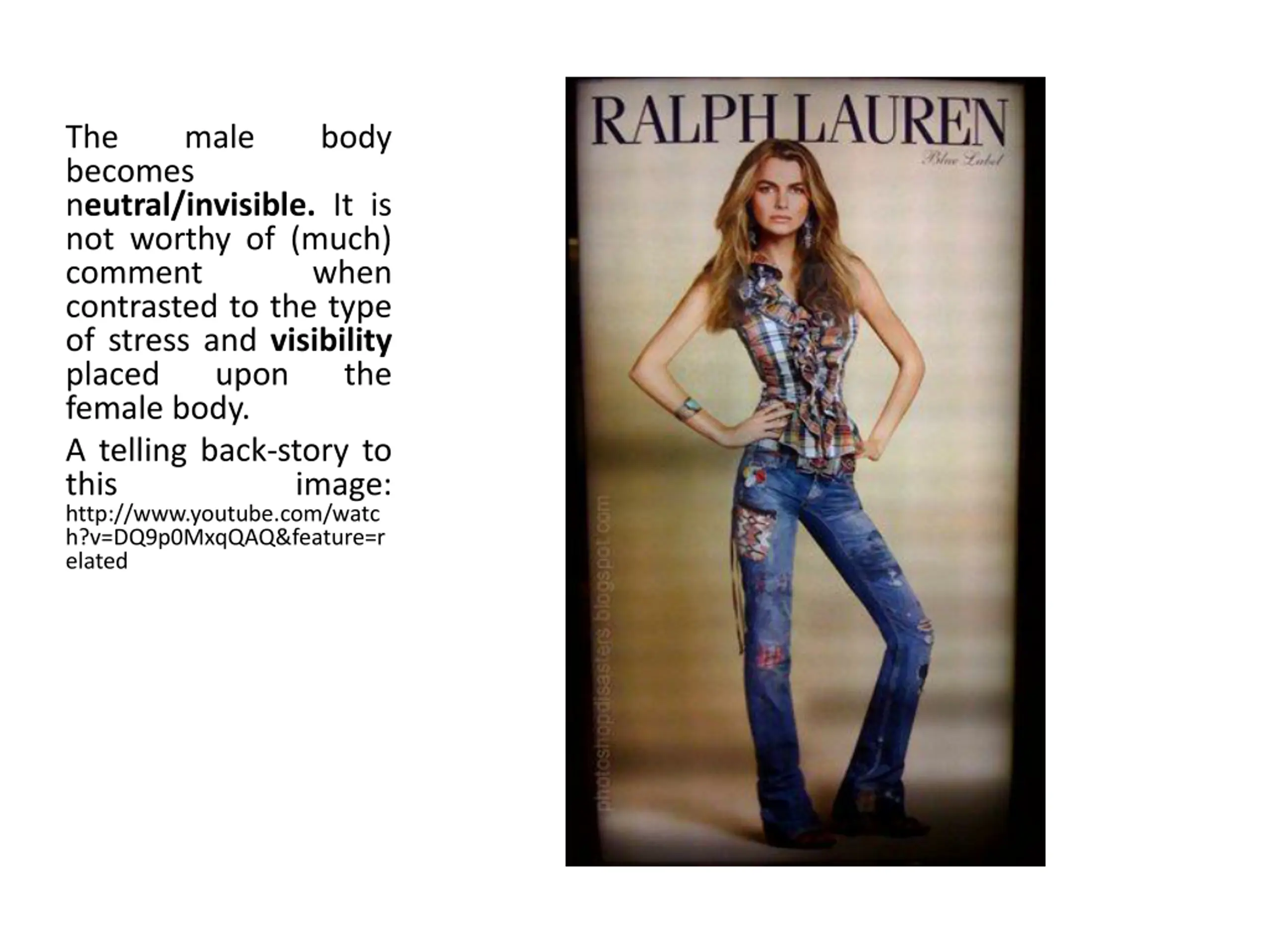 The becomes neutral/invisible. It is not worthy of (much) comment contrasted to the type of stress and visibility placed upon female body. A telling back-story to this http://www.youtube.com/watc h?v=DQ9p0MxqQAQ&feature=r elated male body when the image:
