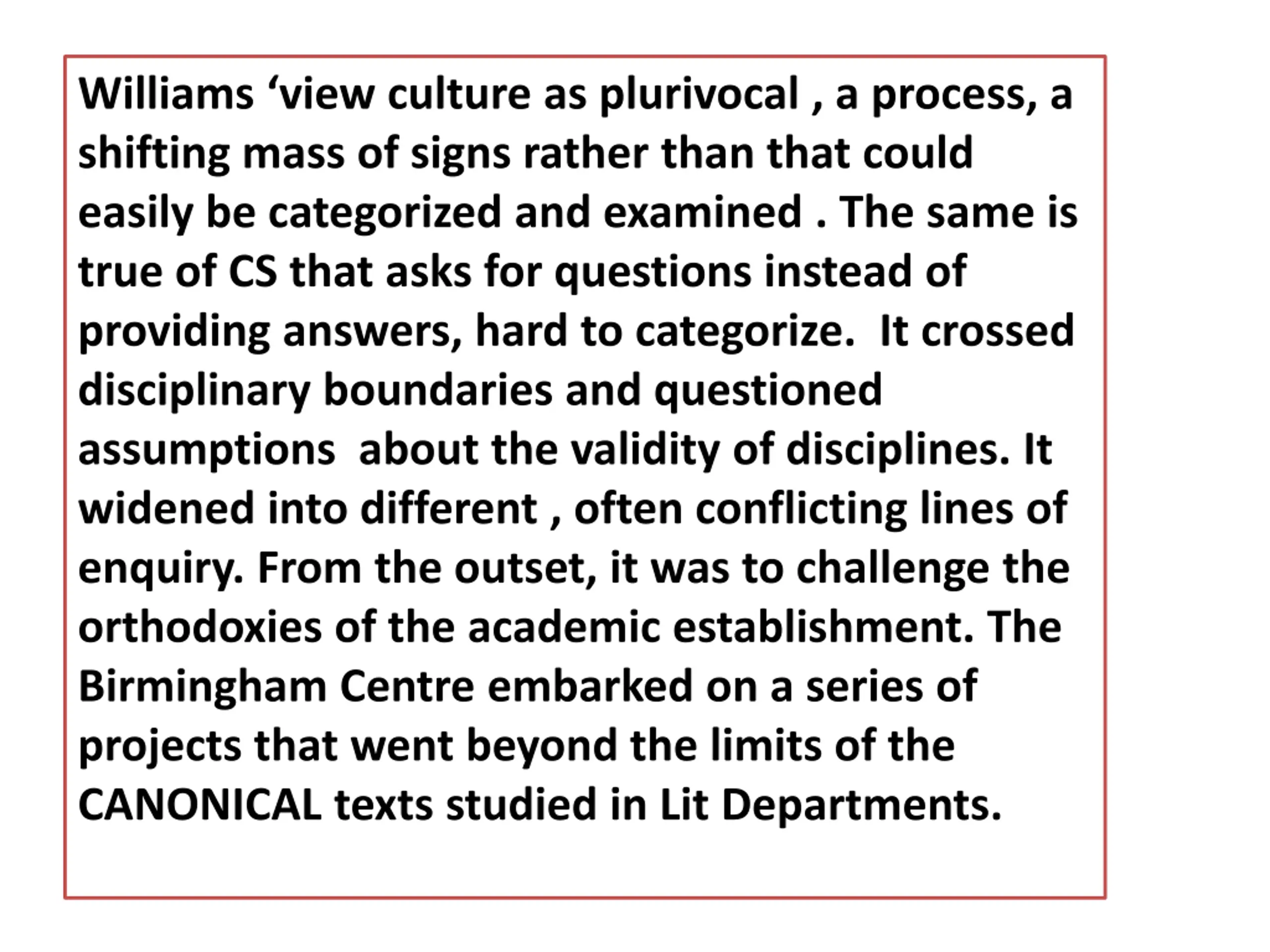 Williams view culture as plurivocal , a process, a shifting mass of signs rather than that could easily be categorized and examined . The same is true of CS that asks for questions instead of providing answers, hard to categorize. It crossed disciplinary boundaries and questioned assumptions about the validity of disciplines. It widened into different , often conflicting lines of enquiry. From the outset, it was to challenge the orthodoxies of the academic establishment. The Birmingham Centre embarked on a series of projects that went beyond the limits of the CANONICAL texts studied in Lit Departments.