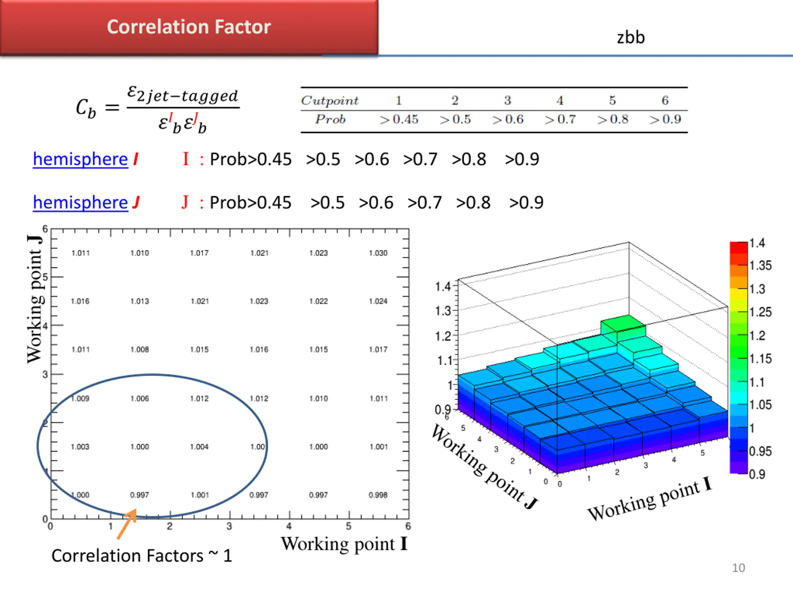 2D B_likelihood Correlation Factor zbb ??=?2??? ?????? ?????? I : Prob>0.45 >0.5 >0.6 >0.7 >0.8 >0.9 hemisphere I J : Prob>0.45 >0.5 >0.6 >0.7 >0.8 >0.9 hemisphere J Working point J Working point I Correlation Factors ~ 1 10