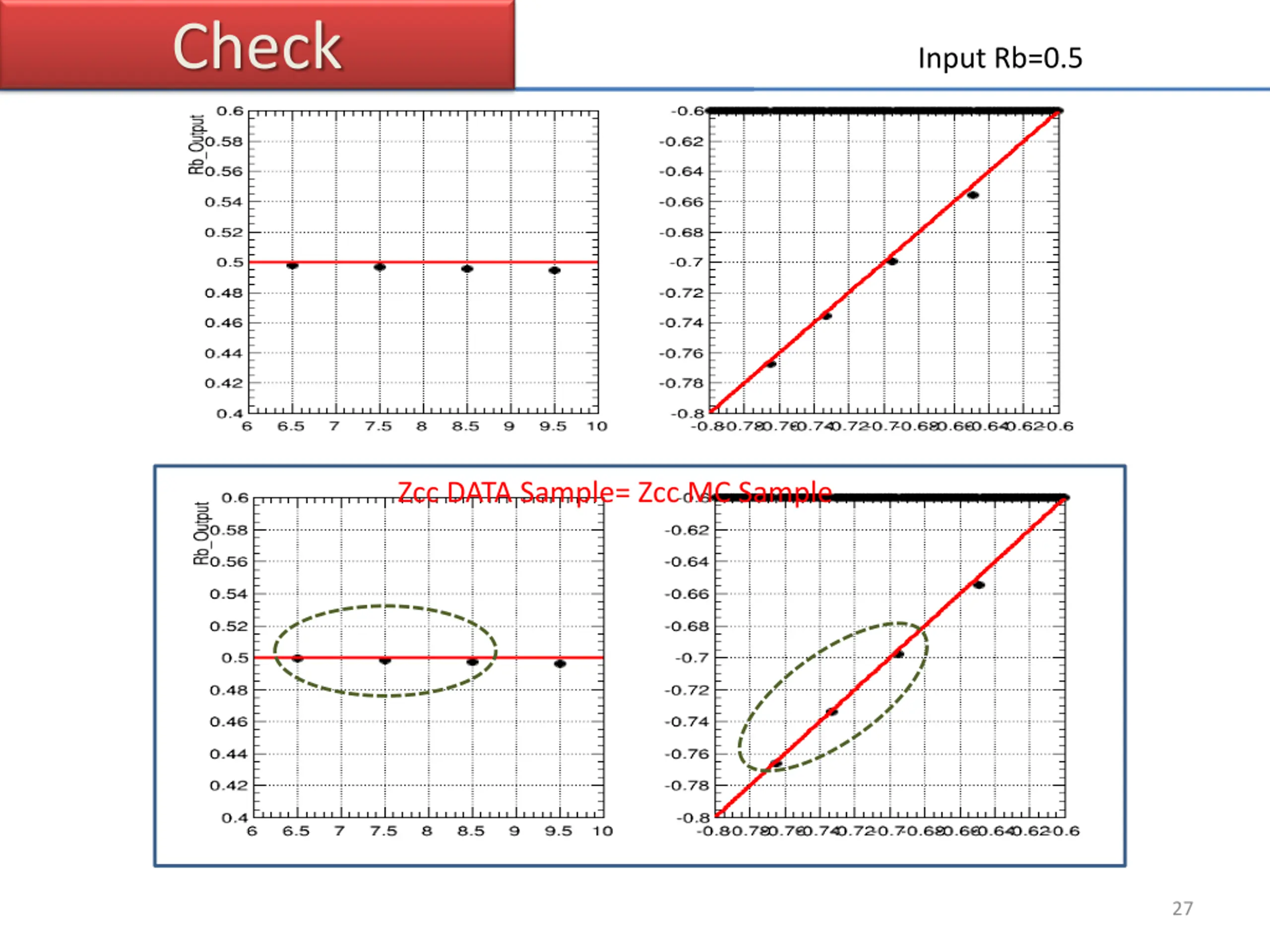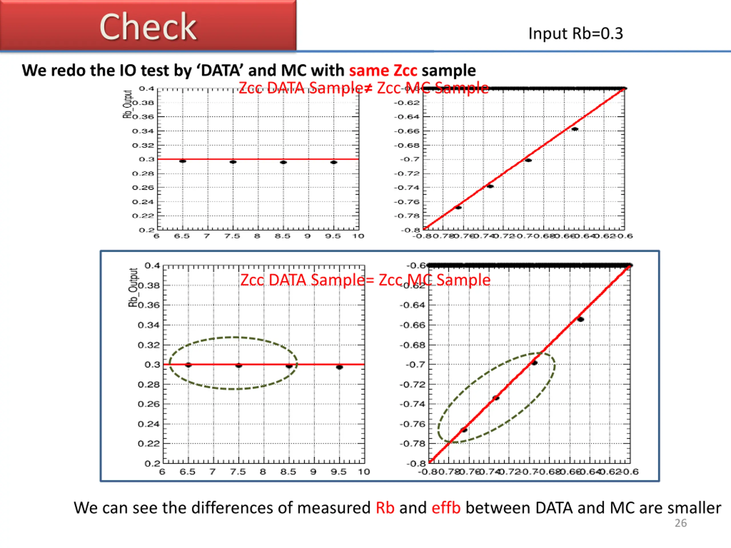 Check Input Rb=0.3 We redo the IO test by DATA and MC with same Zcc sample Zcc DATA Sample Zcc MC Sample Zcc DATA Sample= Zcc MC Sample We can see the differences of measured Rb and effb between DATA and MC are smaller 26