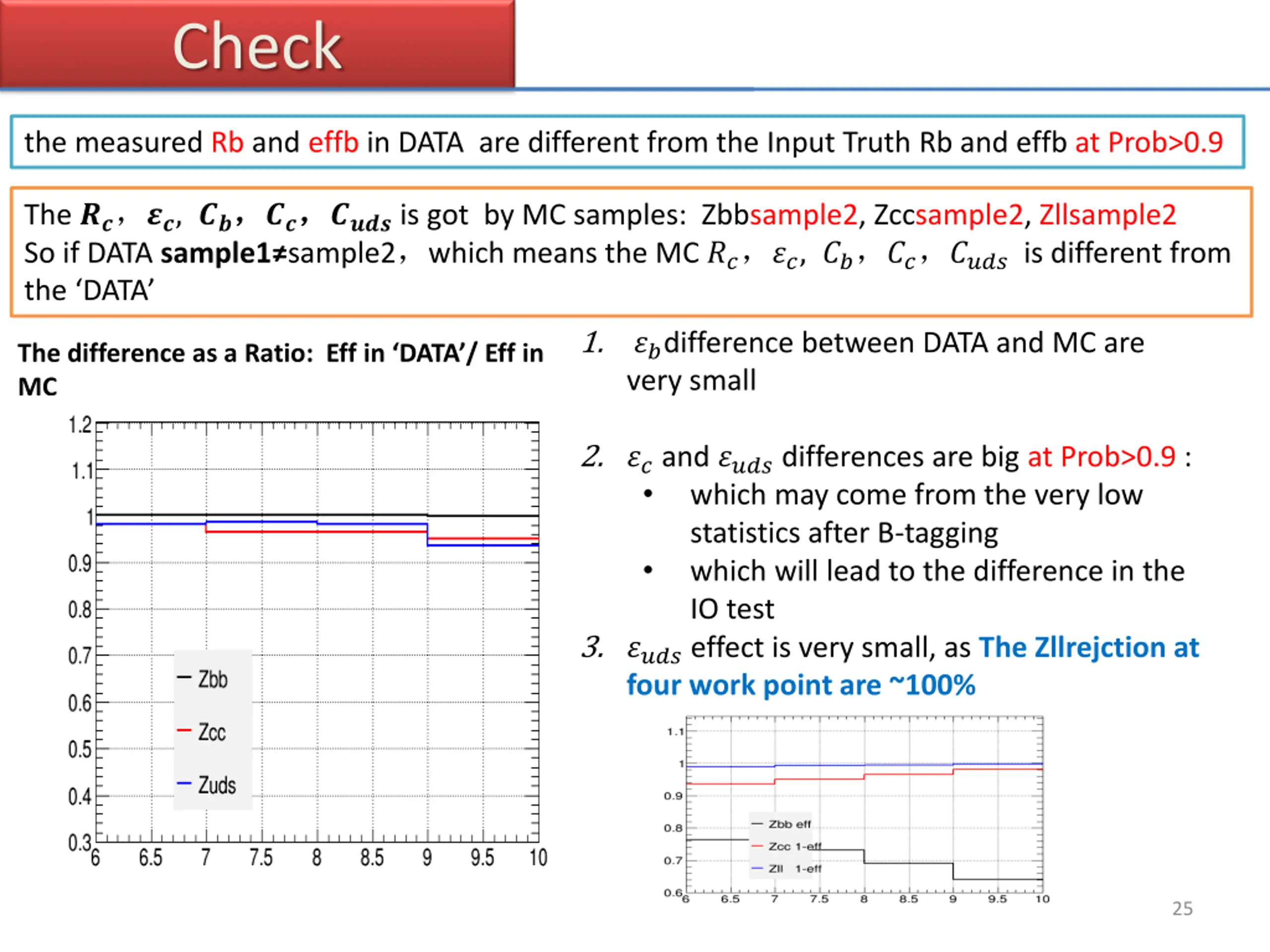 Check the measured Rb and effb in DATA are different from the Input Truth Rb and effb at Prob>0.9 The ?? ??, ?? So if DATA sample1 sample2 which means the MC ?? ??, ?? ?? ????is different from the DATA ?? ????is got by MC samples: Zbbsample2, Zccsample2, Zllsample2 1. ??difference between DATA and MC are very small The difference as a Ratio: Eff in DATA / Eff in MC 2. ??and ????differences are big at Prob>0.9 : which may come from the very low statistics after B-tagging which will lead to the difference in the IO test 3. ????effect is very small, as The Zllrejction at four work point are ~100% 25