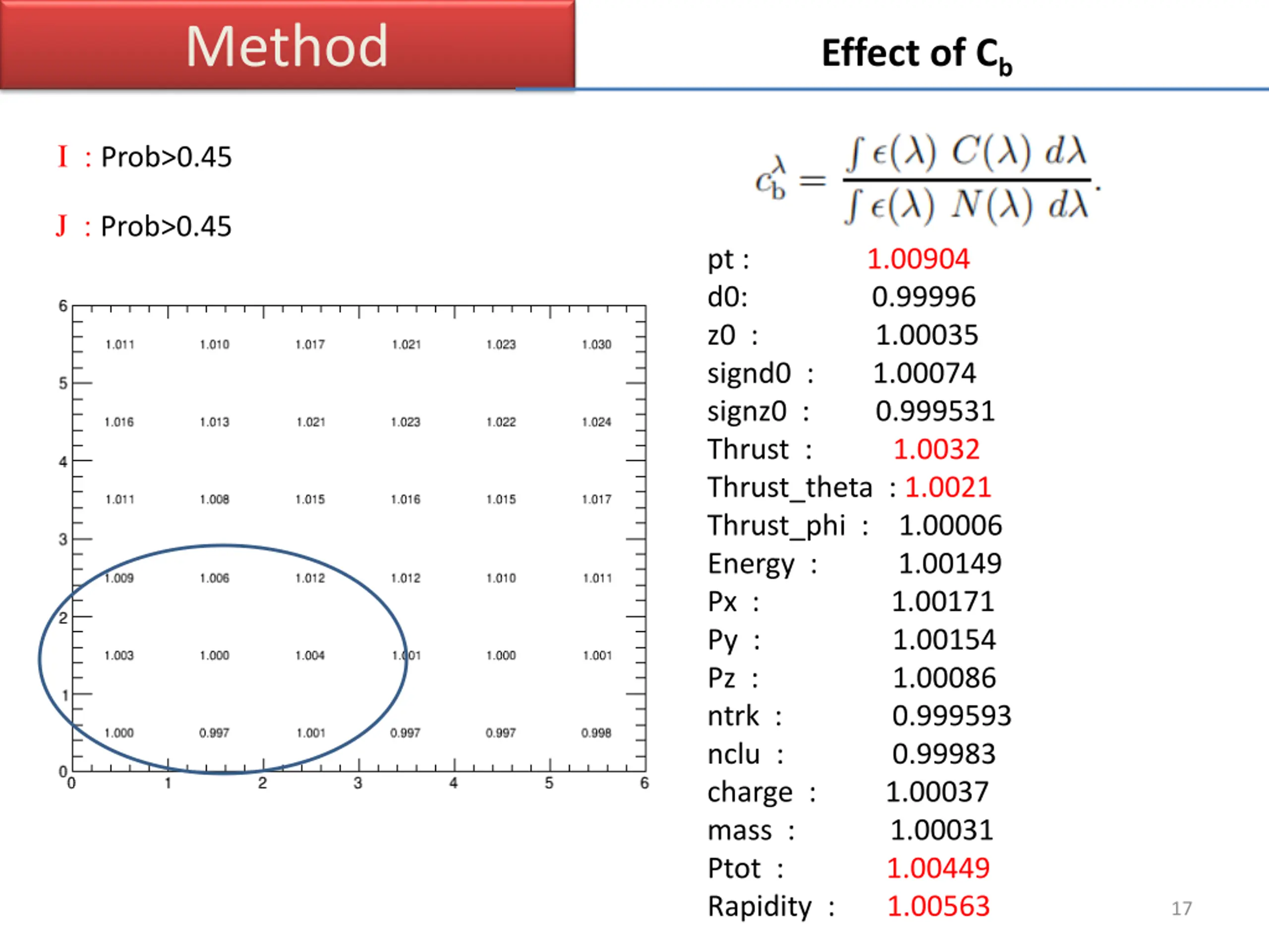 Method Effect of Cb I : Prob>0.45 J : Prob>0.45 pt : 1.00904 d0: 0.99996 z0 : 1.00035 signd0 : 1.00074 signz0 : 0.999531 Thrust : 1.0032 Thrust_theta : 1.0021 Thrust_phi : 1.00006 Energy : 1.00149 Px : 1.00171 Py : Pz : ntrk : nclu : charge : mass : 1.00031 Ptot : 1.00449 Rapidity : 1.00563 1.00154 1.00086 0.999593 0.99983 1.00037 17