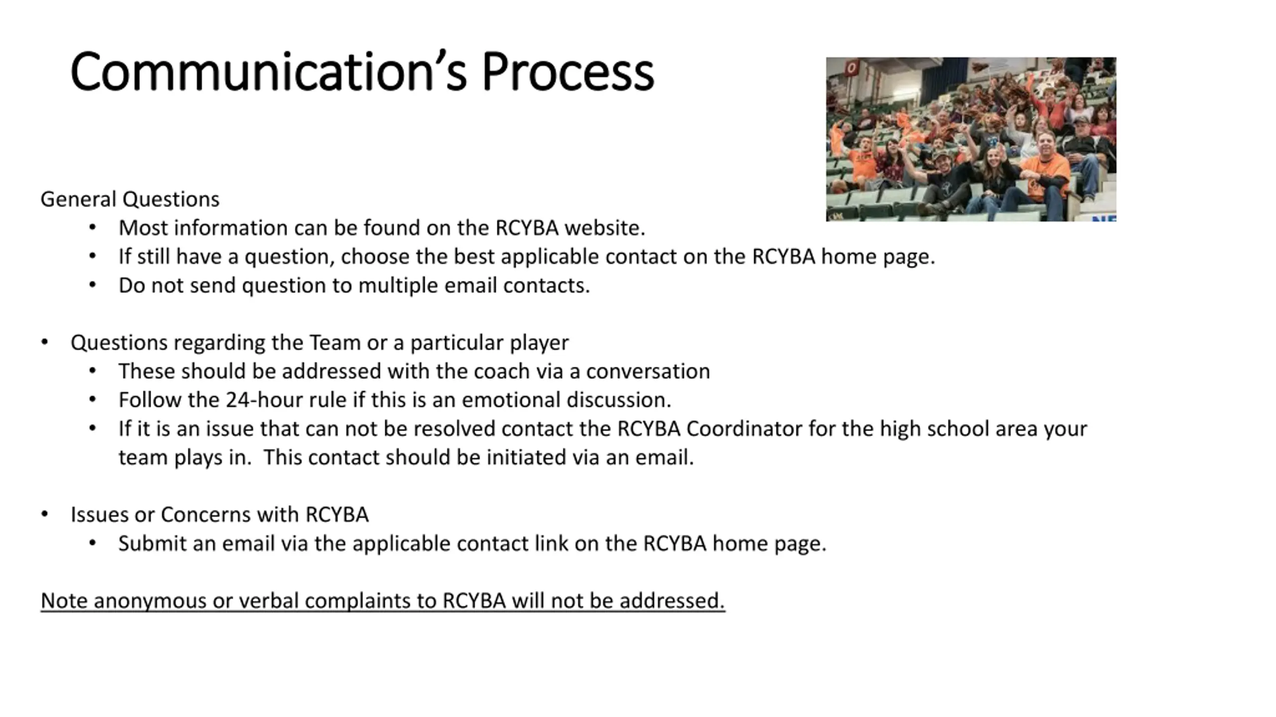 Communications Process Communication s Process General Questions Most information can be found on the RCYBA website. If still have a question, choose the best applicable contact on the RCYBA home page. Do not send question to multiple email contacts. Questions regarding the Team or a particular player These should be addressed with the coach via a conversation Follow the 24-hour rule if this is an emotional discussion. If it is an issue that can not be resolved contact the RCYBA Coordinator for the high school area your team plays in. This contact should be initiated via an email. Issues or Concerns with RCYBA Submit an email via the applicable contact link on the RCYBA home page. Note anonymous or verbal complaints to RCYBA will not be addressed.
