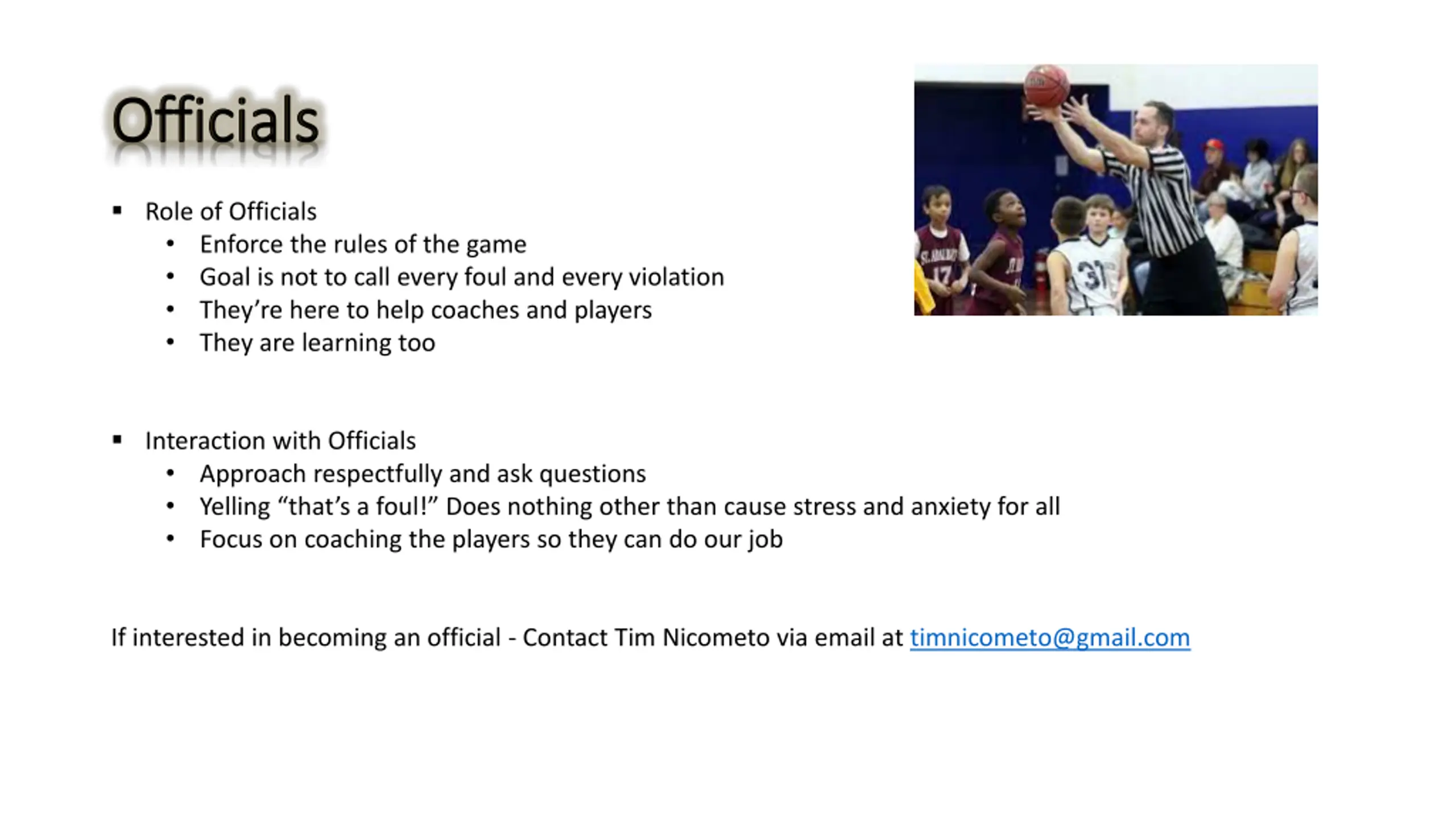 Officials Officials Role of Officials Enforce the rules of the game Goal is not to call every foul and every violation They re here to help coaches and players They are learning too Interaction with Officials Approach respectfully and ask questions Yelling that s a foul! Does nothing other than cause stress and anxiety for all Focus on coaching the players so they can do our job If interested in becoming an official - Contact Tim Nicometo via email at timnicometo@gmail.com