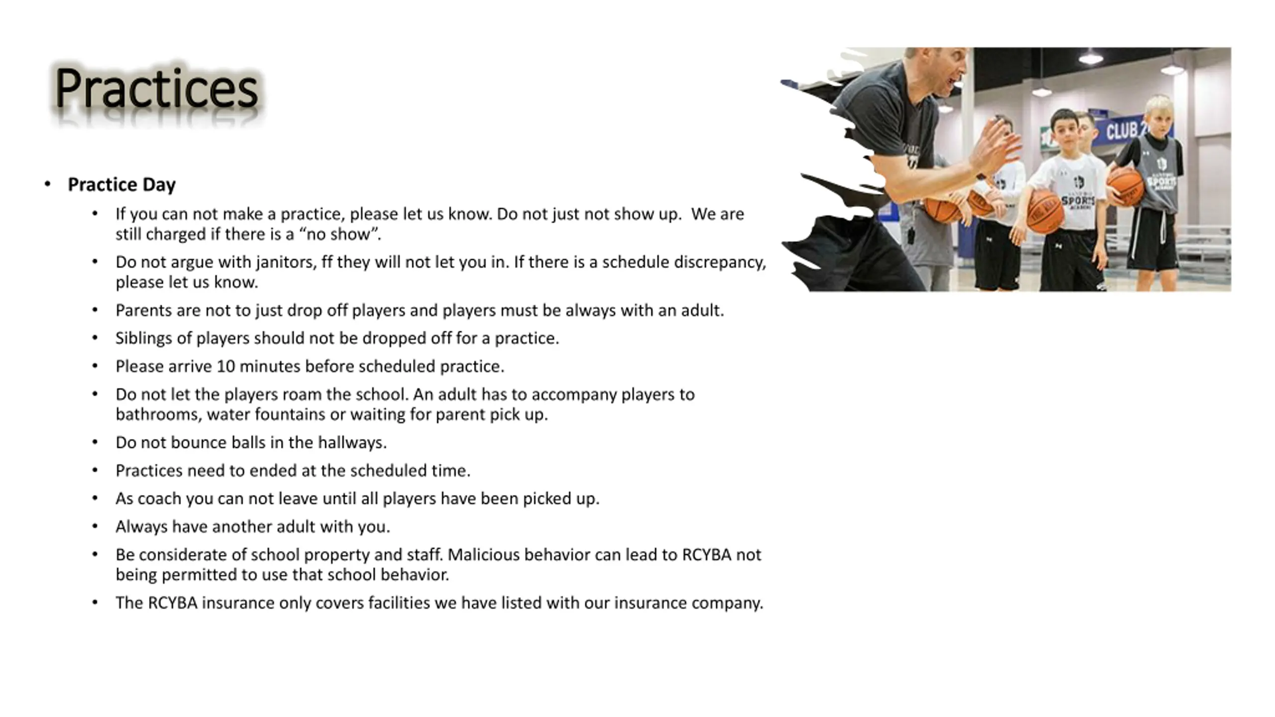 Practices Practices Practice Day If you can not make a practice, please let us know. Do not just not show up. We are still charged if there is a no show . Do not argue with janitors, ff they will not let you in. If there is a schedule discrepancy, please let us know. Parents are not to just drop off players and players must be always with an adult. Siblings of players should not be dropped off for a practice. Please arrive 10 minutes before scheduled practice. Do not let the players roam the school. An adult has to accompany players to bathrooms, water fountains or waiting for parent pick up. Do not bounce balls in the hallways. Practices need to ended at the scheduled time. As coach you can not leave until all players have been picked up. Always have another adult with you. Be considerate of school property and staff. Malicious behavior can lead to RCYBA not being permitted to use that school behavior. The RCYBA insurance only covers facilities we have listed with our insurance company.