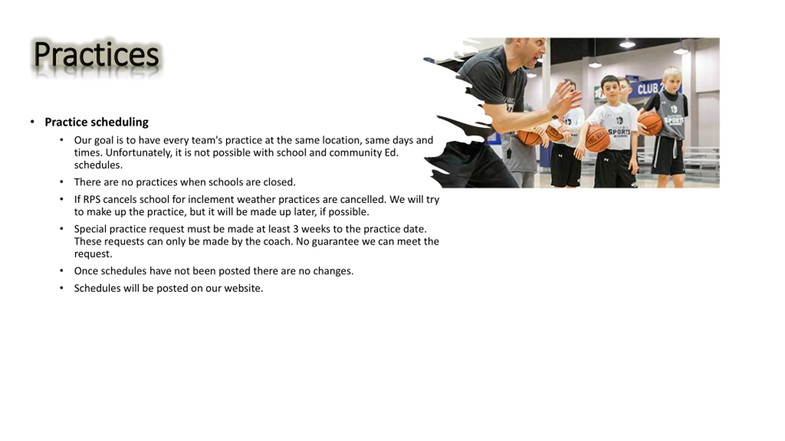 Practices Practices Practice scheduling Our goal is to have every team's practice at the same location, same days and times. Unfortunately, it is not possible with school and community Ed. schedules. There are no practices when schools are closed. If RPS cancels school for inclement weather practices are cancelled. We will try to make up the practice, but it will be made up later, if possible. Special practice request must be made at least 3 weeks to the practice date. These requests can only be made by the coach. No guarantee we can meet the request. Once schedules have not been posted there are no changes. Schedules will be posted on our website.