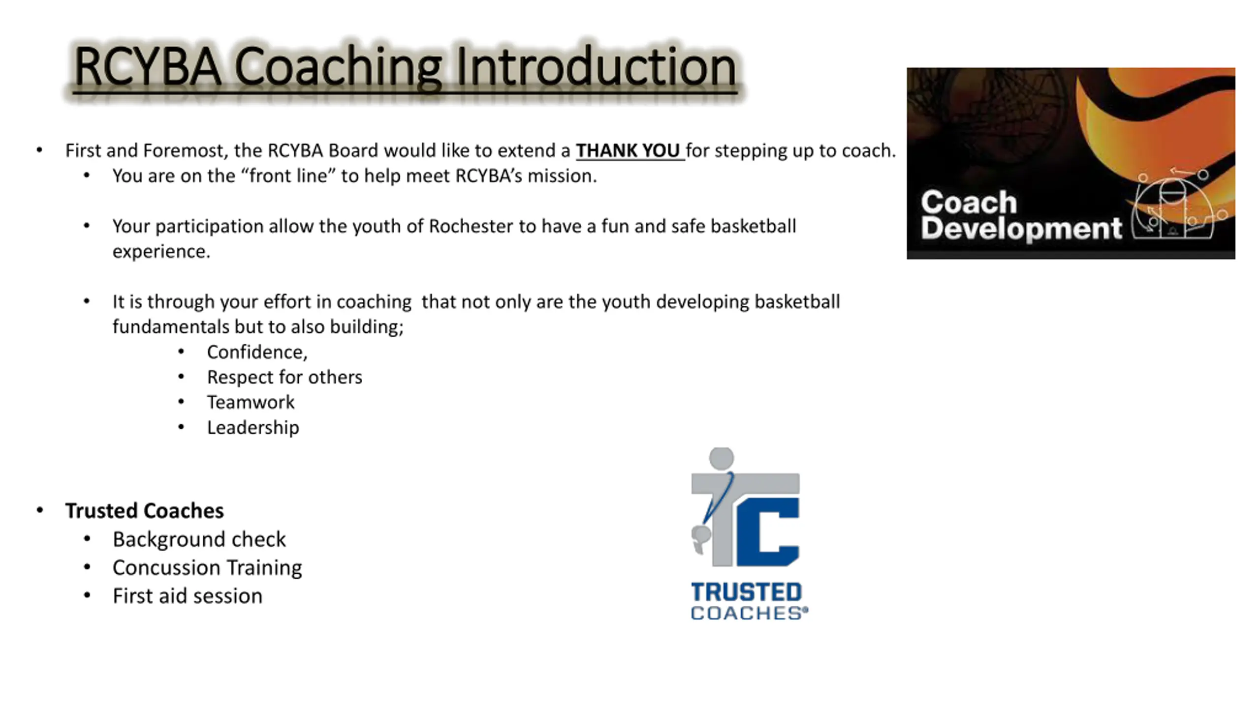 RCYBA Coaching Introduction RCYBA Coaching Introduction First and Foremost, the RCYBA Board would like to extend a THANK YOU for stepping up to coach. You are on the front line to help meet RCYBA s mission. Your participation allow the youth of Rochester to have a fun and safe basketball experience. It is through your effort in coaching that not only are the youth developing basketball fundamentals but to also building; Confidence, Respect for others Teamwork Leadership Trusted Coaches Background check Concussion Training First aid session