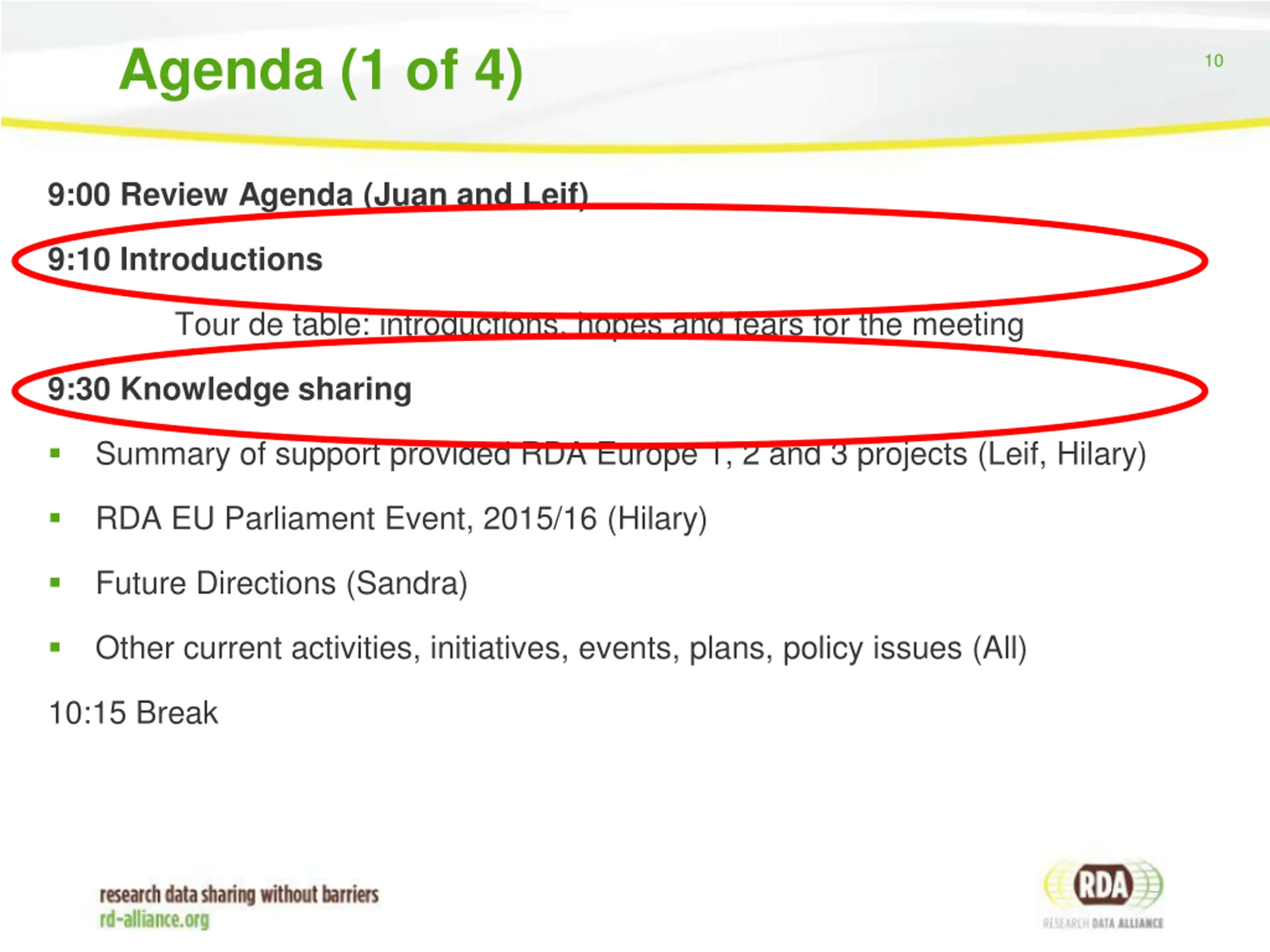Agenda 9 9:00 Review Agenda 9:10 Introductions Tour de table: introductions, hopes and fears for the meeting 9:30 Knowledge sharing 10:15 Break 10:45 Creating a broad RDA initiative in Europe 12:00 Lunch 13:00 Establishing European priorities for RDA 14:00 Developing plans for what future RDA Europe projects should do 14:45 Sum up and planning 15:00 Close