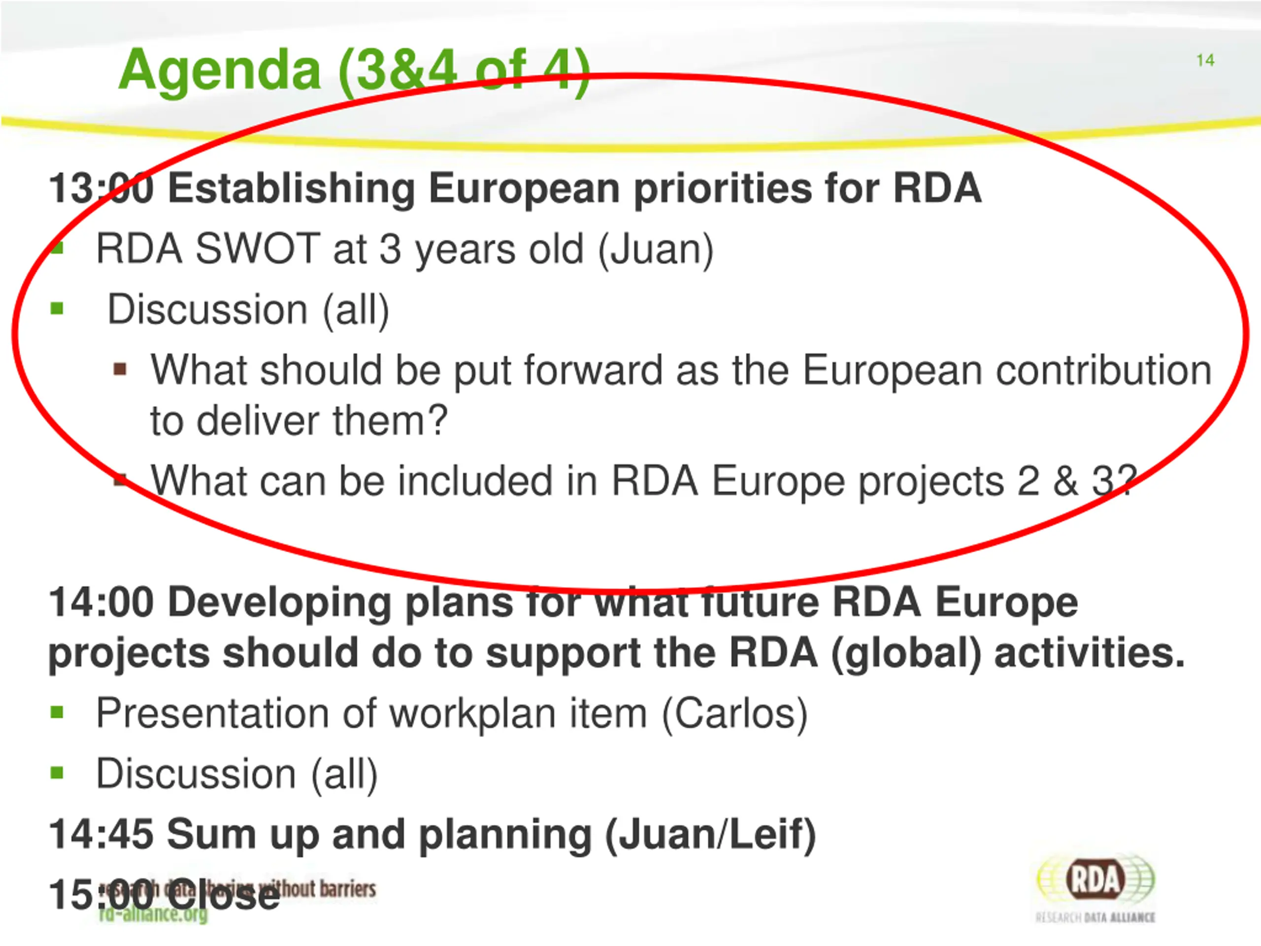 Agenda (3&4 of 4) 14 13:00 Establishing European priorities for RDA RDA SWOT at 3 years old (Juan) Discussion (all) What should be put forward as the European contribution to deliver them? What can be included in RDA Europe projects 2 & 3? 14:00 Developing plans for what future RDA Europe projects should do to support the RDA (global) activities. Presentation of workplan item (Carlos) Discussion (all) 14:45 Sum up and planning (Juan/Leif) 15:00 Close