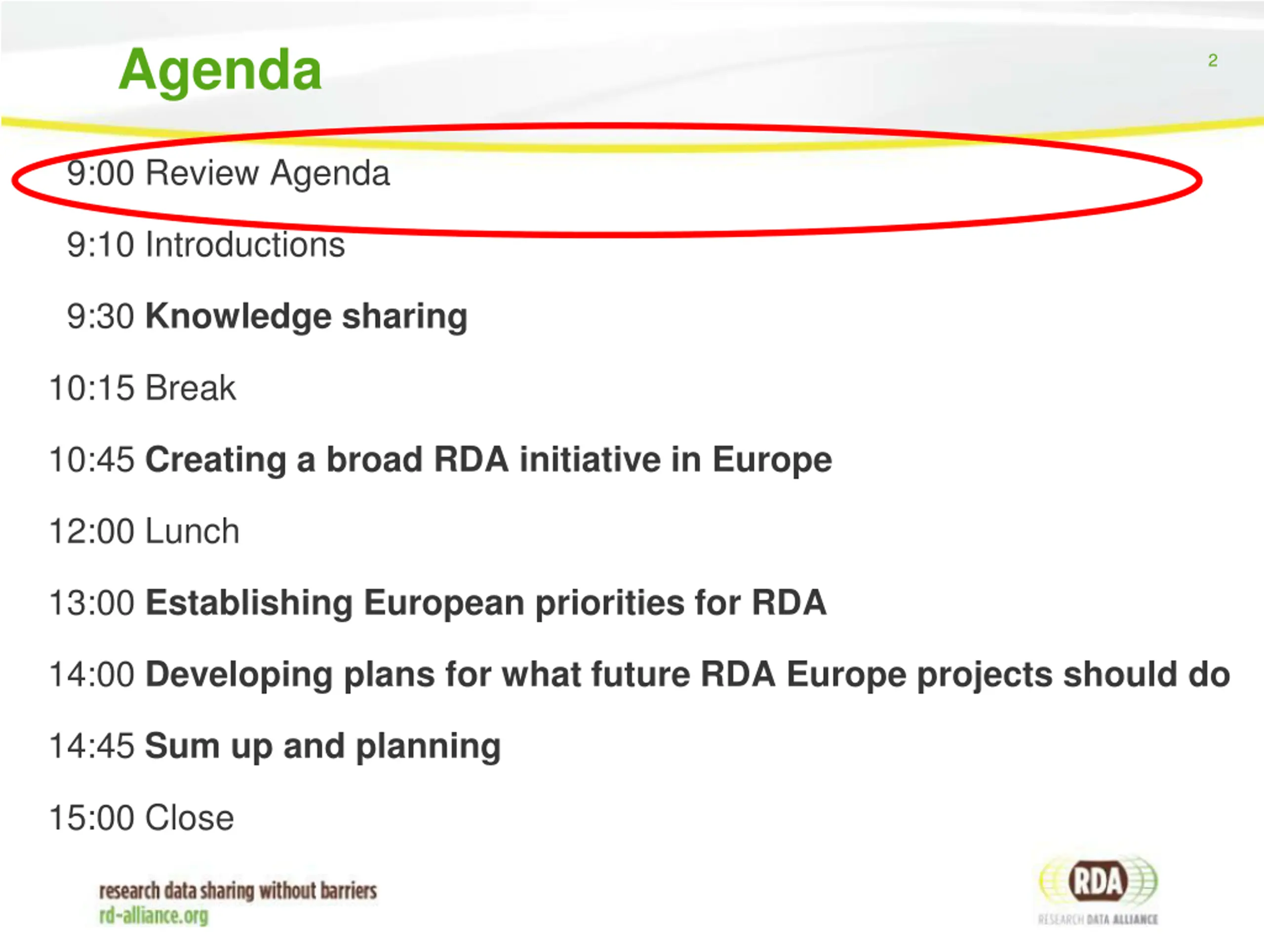 Agenda 2 9:00 Review Agenda 9:10 Introductions 9:30 Knowledge sharing 10:15 Break 10:45 Creating a broad RDA initiative in Europe 12:00 Lunch 13:00 Establishing European priorities for RDA 14:00 Developing plans for what future RDA Europe projects should do 14:45 Sum up and planning 15:00 Close