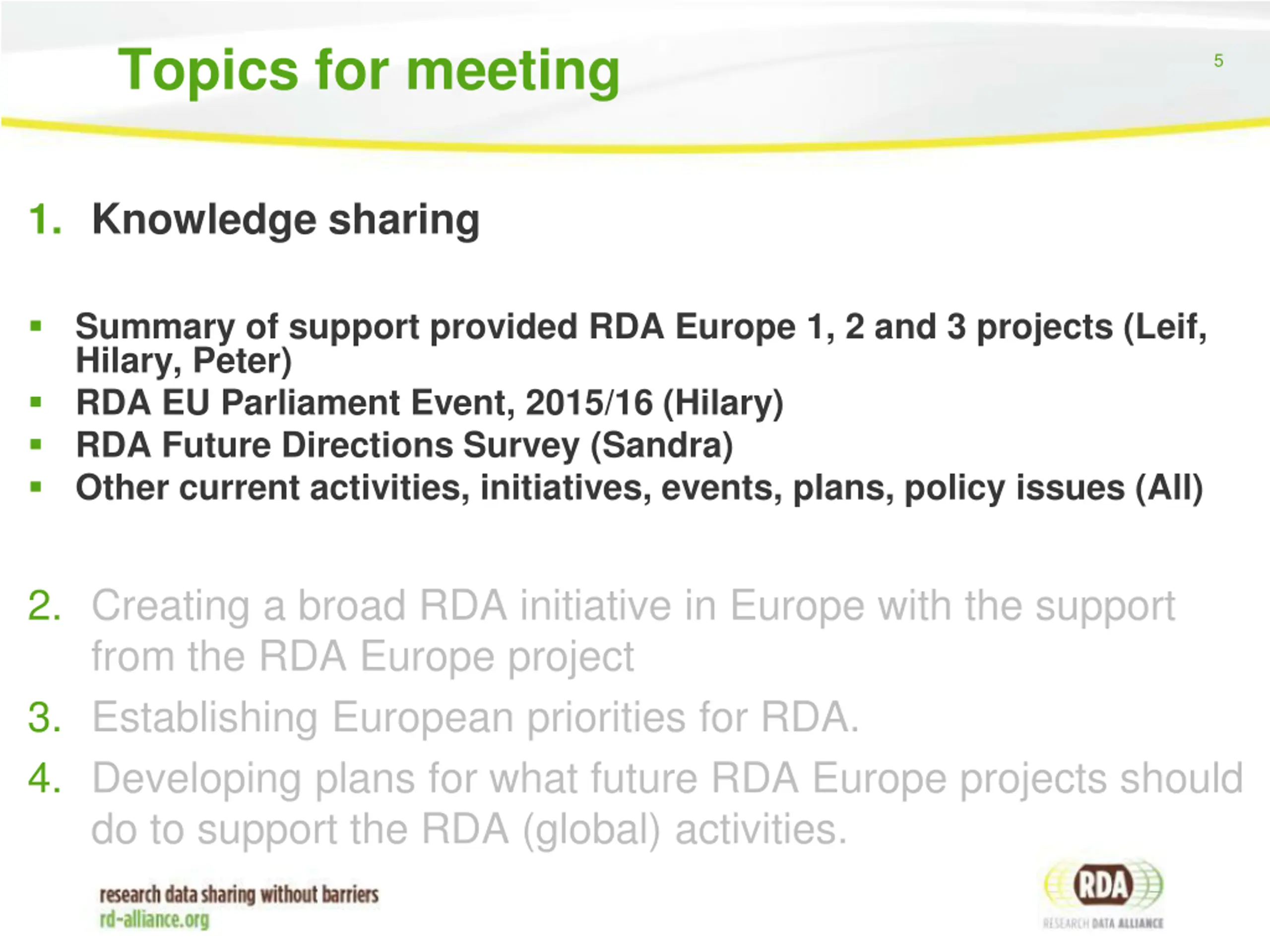 Topics for meeting 4 1. Knowledge sharing 2. Creating a broad RDA initiative in Europe with the support from the RDA Europe project 3. Establishing European priorities for RDA. 4. Developing plans for what future RDA Europe projects should do to support the RDA (global) activities.