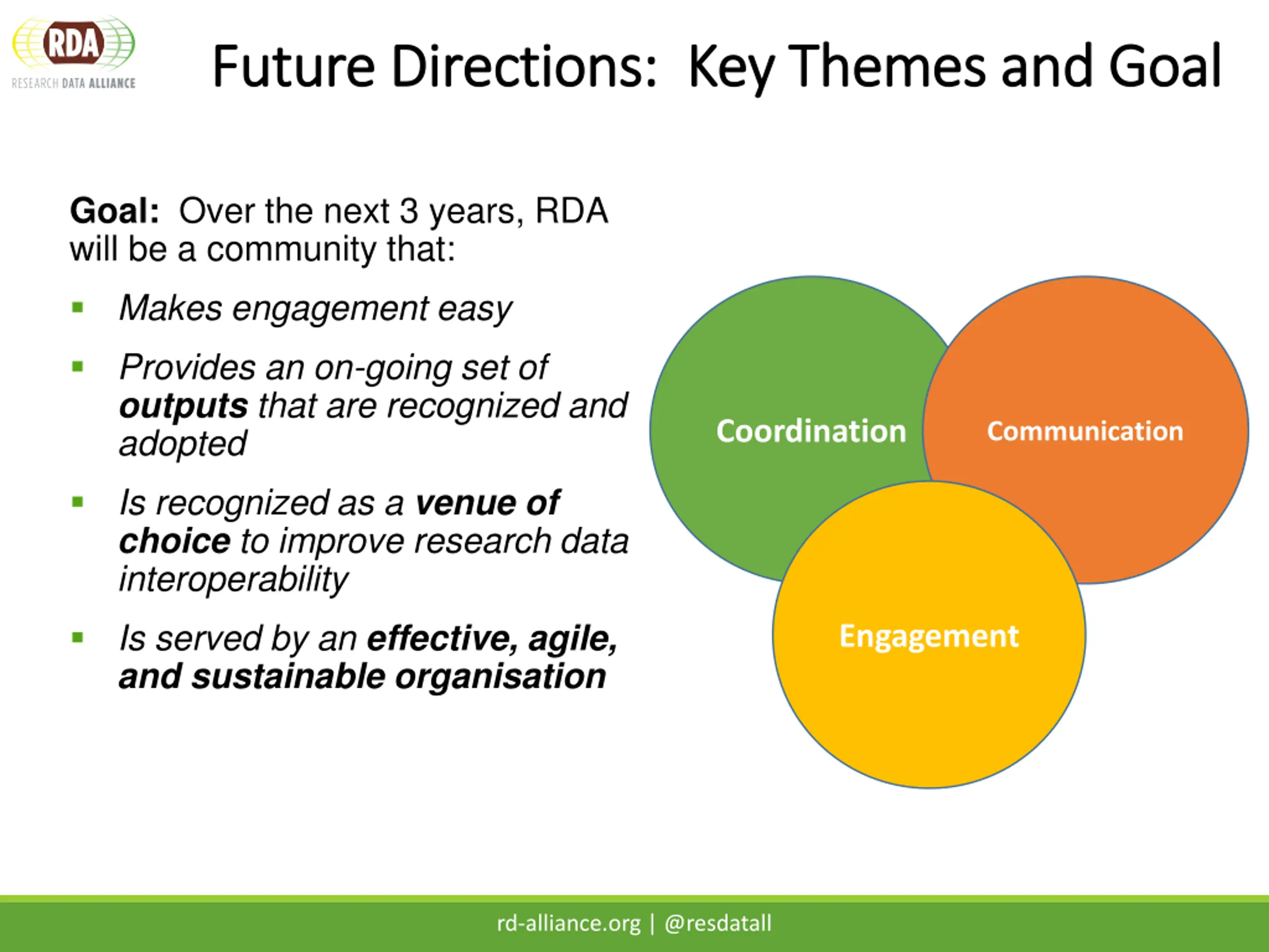 Future Directions: Key Themes and Goal Future Directions: Key Themes and Goal Goal: Over the next 3 years, RDA will be a community that: Makes engagement easy Provides an on-going set of outputs that are recognized and adopted Coordination Communication Is recognized as a venue of choice to improve research data interoperability Is served by an effective, agile, and sustainable organisation Engagement rd-alliance.org | @resdatall