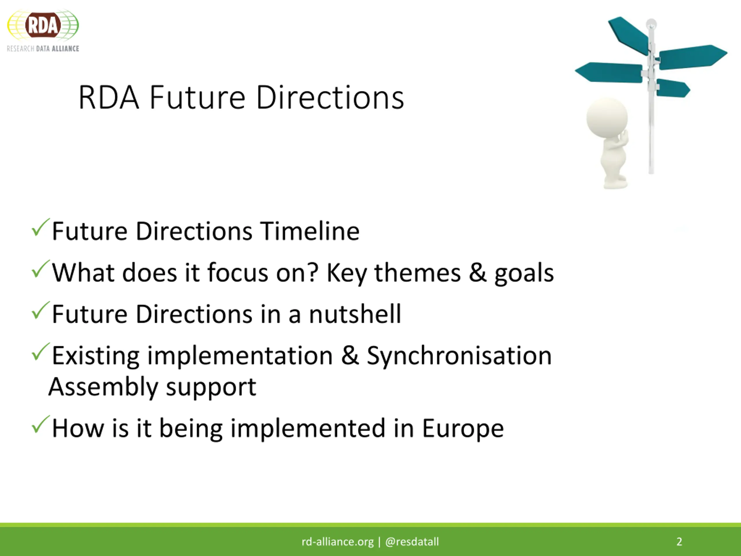RDA Future Directions Future Directions Timeline What does it focus on? Key themes & goals Future Directions in a nutshell Existing implementation & Synchronisation Assembly support How is it being implemented in Europe rd-alliance.org | @resdatall 2