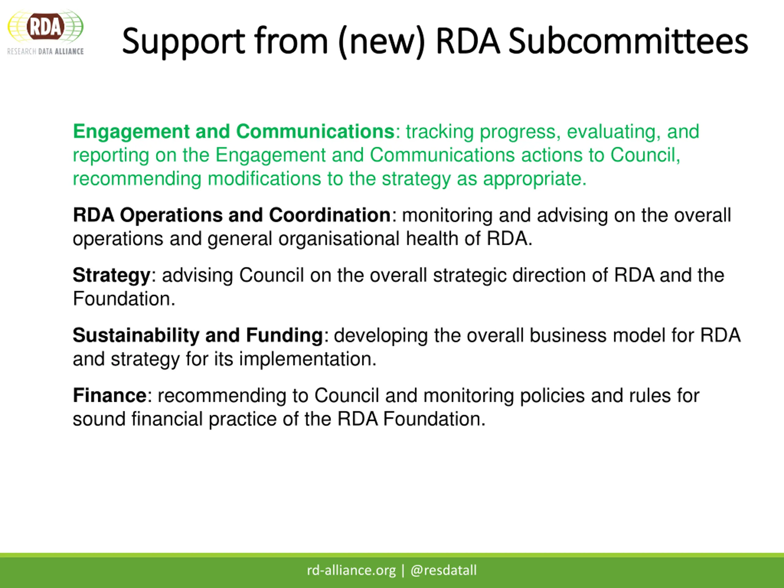 Support from (new) RDA Subcommittees Support from (new) RDA Subcommittees Engagement and Communications: tracking progress, evaluating, and reporting on the Engagement and Communications actions to Council, recommending modifications to the strategy as appropriate. RDA Operations and Coordination: monitoring and advising on the overall operations and general organisational health of RDA. Strategy: advising Council on the overall strategic direction of RDA and the Foundation. Sustainability and Funding: developing the overall business model for RDA and strategy for its implementation. Finance: recommending to Council and monitoring policies and rules for sound financial practice of the RDA Foundation. rd-alliance.org | @resdatall